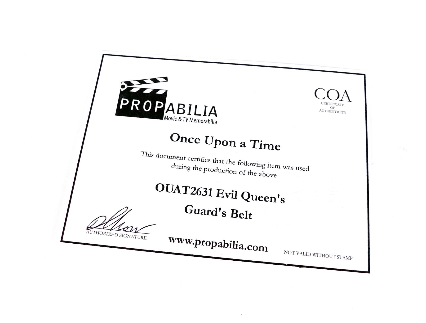 Propabilia guarantees the attribution of each lot of Property as stated in the title block of that lot of Property in the Auction catalogue, each lot of property comes with its own Certificate of Authenticity (COA). Bidders should be aware that multiple examples of props and costumes are frequently used during production (hence the Propmasters saying 'one and done'), usually as few as 3 or as many as 6 or more pieces may be used to represent the item on screen. It is often impossible to determine whether a specific piece has been used on-camera. Any specific details about the property known to Propabilia will be noted within the description, but no warranties are given by Propabilia as to that description.