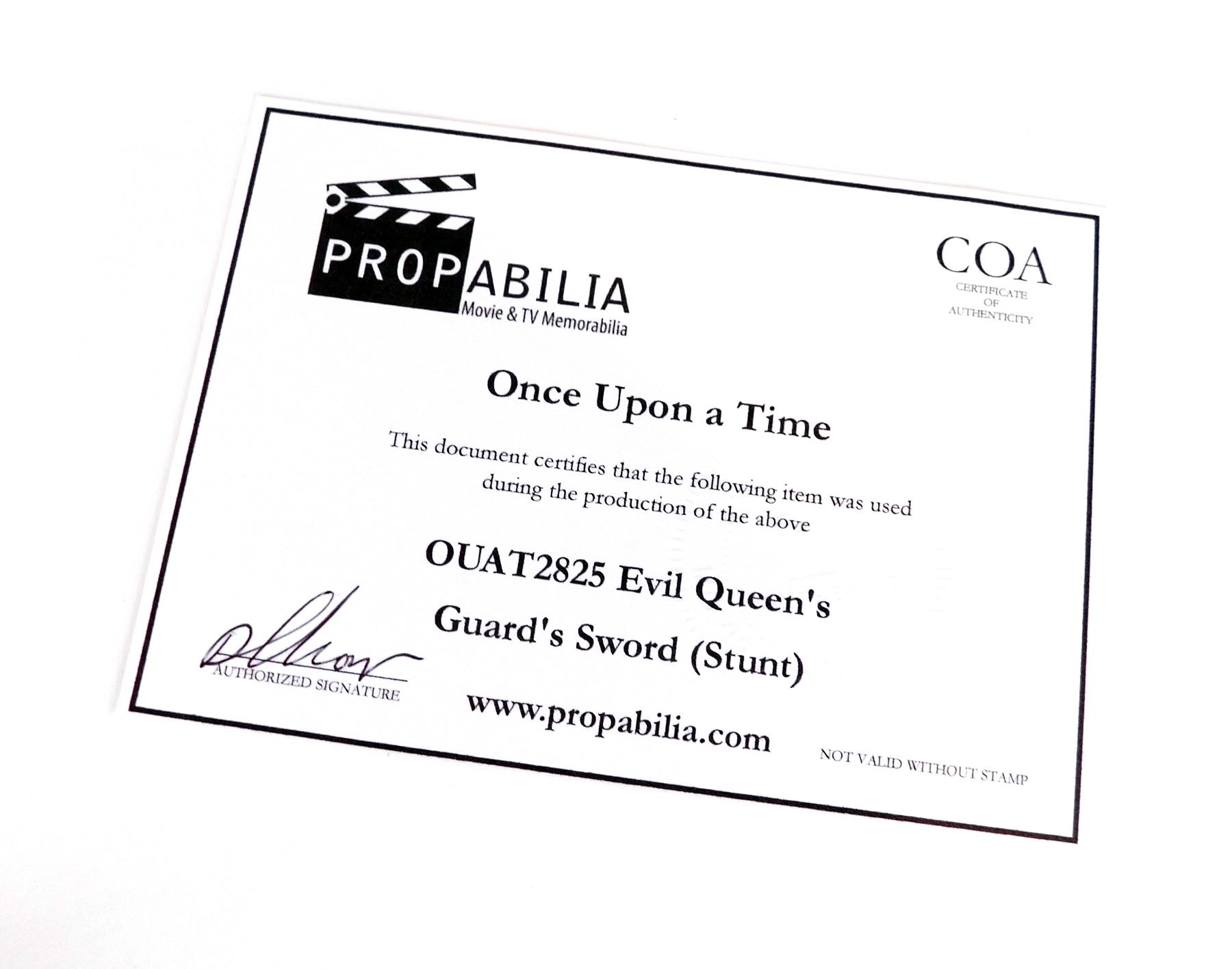 Propabilia guarantees the attribution of each lot of Property as stated in the title block of that lot of Property in the Auction catalogue, each lot of property comes with its own Certificate of Authenticity (COA). Bidders should be aware that multiple examples of props and costumes are frequently used during production (hence the Propmasters saying 'one and done'), usually as few as 3 or as many as 6 or more pieces may be used to represent the item on screen. It is often impossible to determine whether a specific piece has been used on-camera. Any specific details about the property known to Propabilia will be noted within the description, but no warranties are given by Propabilia as to that description.