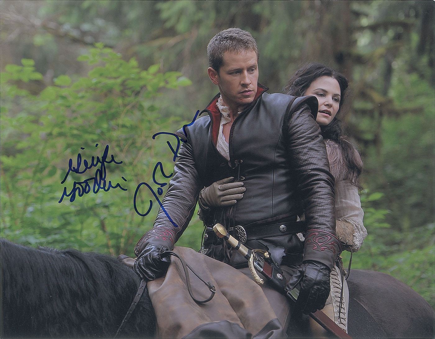 Color satin-finish 14 x 11 photo of Prince Charming and Snow White from the ABC fairy tale television series Once Upon a Time, signed in blue felt tip by Ginnifer Goodwin and Josh Dallas. In fine condition, with mild corner tip dings. Originally obtained by in-person specialist Mike Wehrmann.