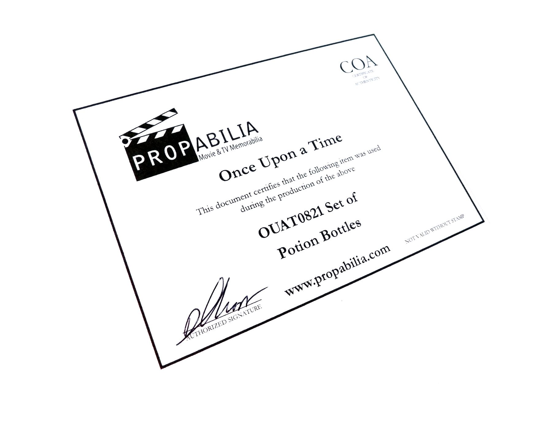 Propabilia guarantees the attribution of each lot of Property as stated in the title block of that lot of Property in the Auction catalogue, each lot of property comes with its own Certificate of Authenticity (COA). Bidders should be aware that multiple examples of props and costumes are frequently used during production (hence the Propmasters saying 'one and done'), usually as few as 3 or as many as 6 or more pieces may be used to represent the item on screen. It is often impossible to determine whether a specific piece has been used on-camera. Any specific details about the property known to Propabilia will be noted within the description, but no warranties are given by Propabilia as to that description.