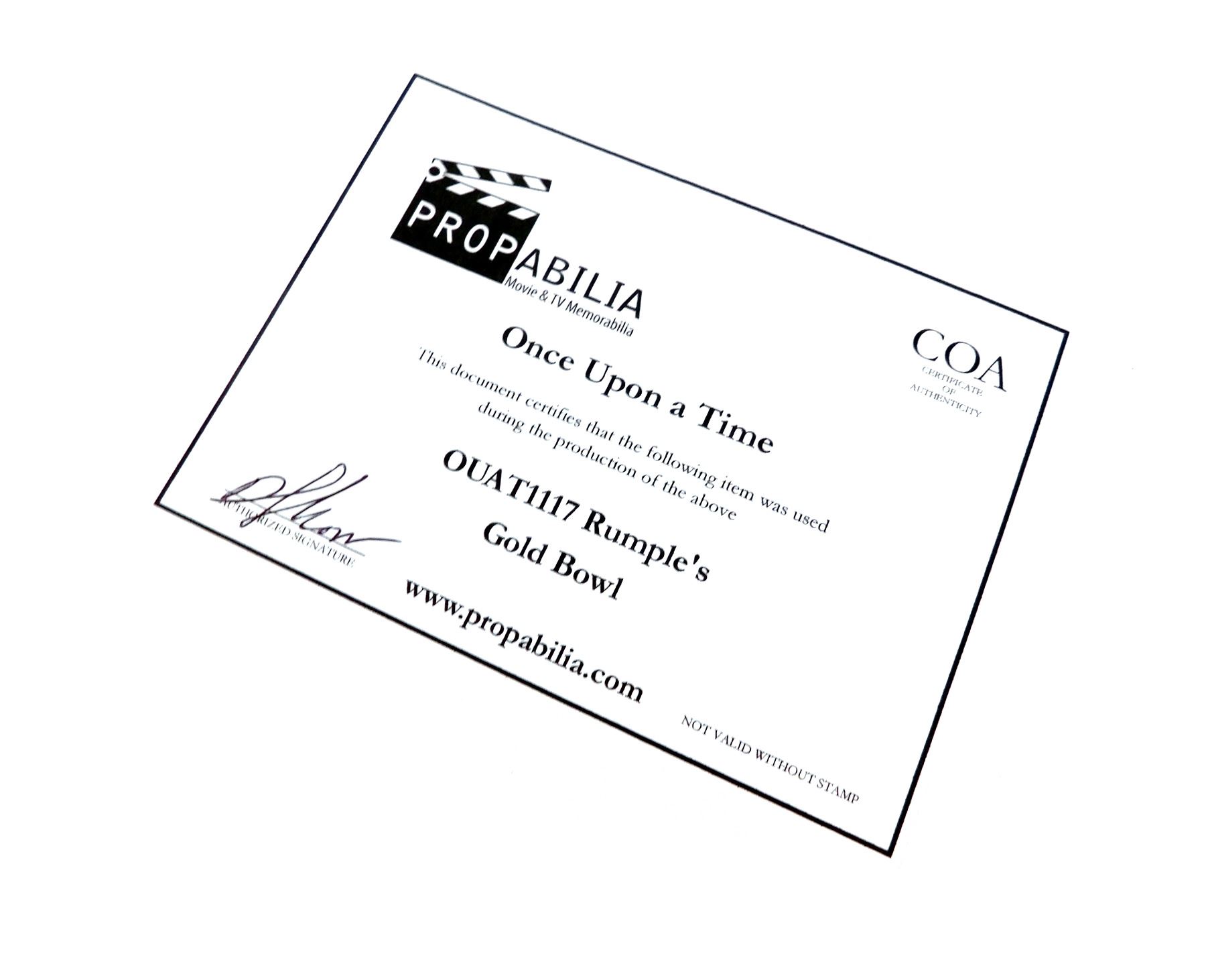 Propabilia guarantees the attribution of each lot of Property as stated in the title block of that lot of Property in the Auction catalogue, each lot of property comes with its own Certificate of Authenticity (COA). Bidders should be aware that multiple examples of props and costumes are frequently used during production (hence the Propmasters saying 'one and done'), usually as few as 3 or as many as 6 or more pieces may be used to represent the item on screen. It is often impossible to determine whether a specific piece has been used on-camera. Any specific details about the property known to Propabilia will be noted within the description, but no warranties are given by Propabilia as to that description.