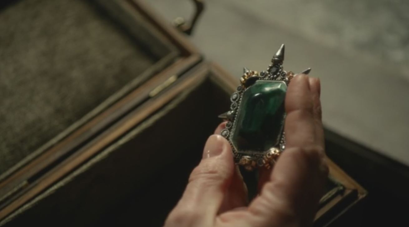 In the mythology of the show, Oz Pendants are gifted to the sisterhood of witches, with each talisman possessing the ability to magnify their powers. These unique pendants are typically white in color. As Zelena turns evil, her pendant assumes a vibrant emerald tone.
