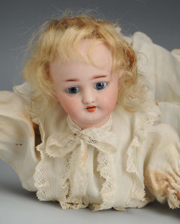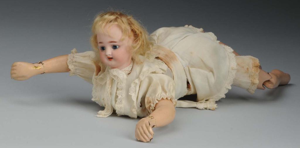 Description Articulated wooden doll with cork torso, bisque head incised "Simon & Halbig", and wind-up mechanism. When wound, hands go back and forth and will swim and float on water. Dressed in possibly original clothing and antique blonde mohair wig. Condition (Very Good). Size 14" L.