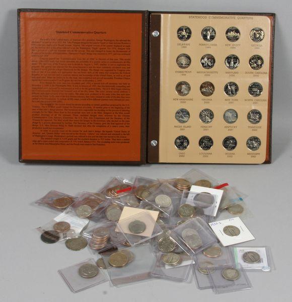 One (1) complete album of state commemorative quarters, plus seventy (70 approx) loose state quarters, plus two (2) liberty heads (1892, 1907), and three (3) standing liberties (ungraded), and two (2) Sacagawea and one (1) Susan B. Anthony, and three (3) Massachusetts tokens.
