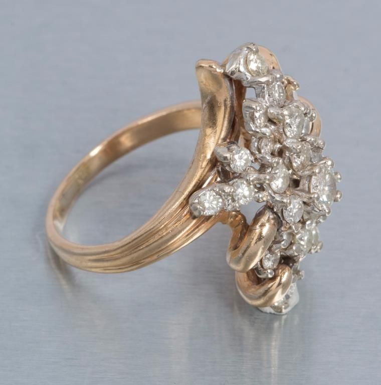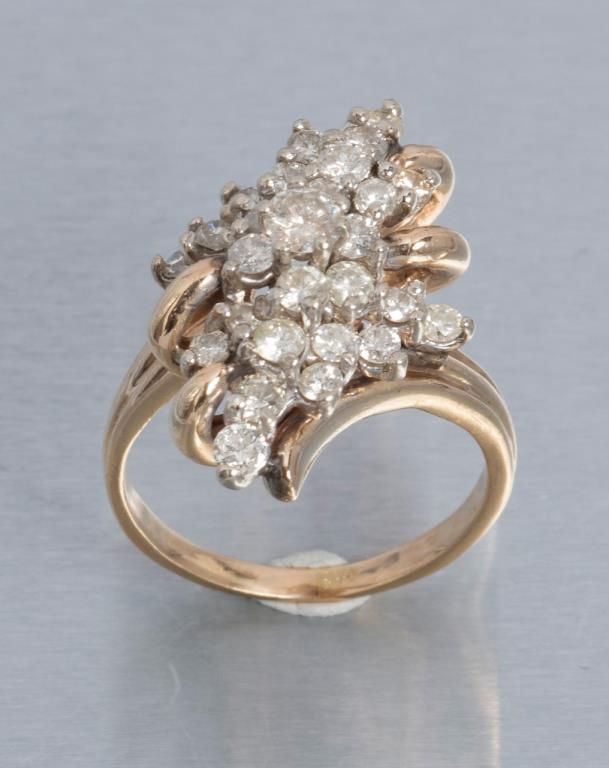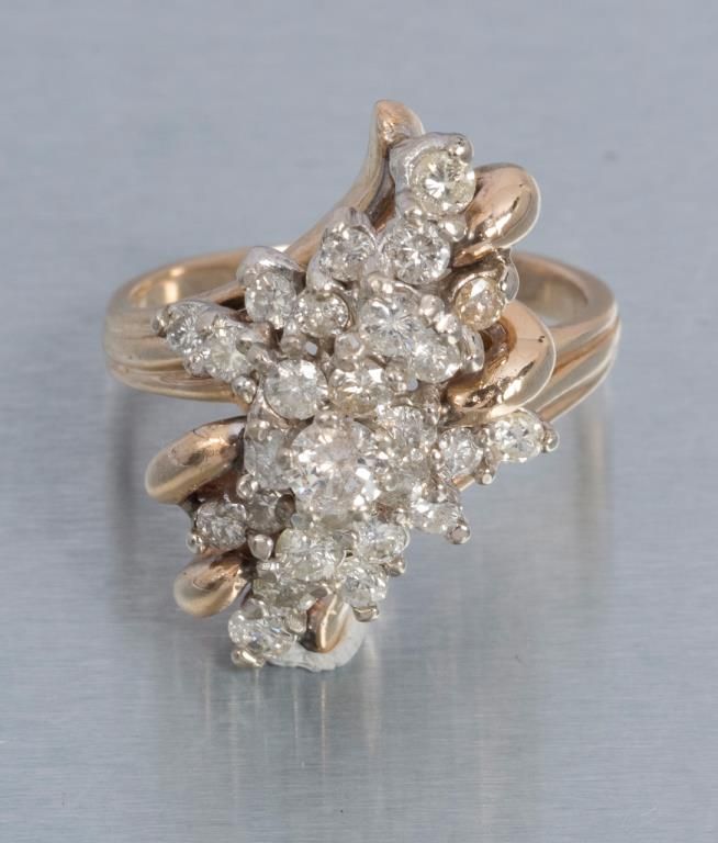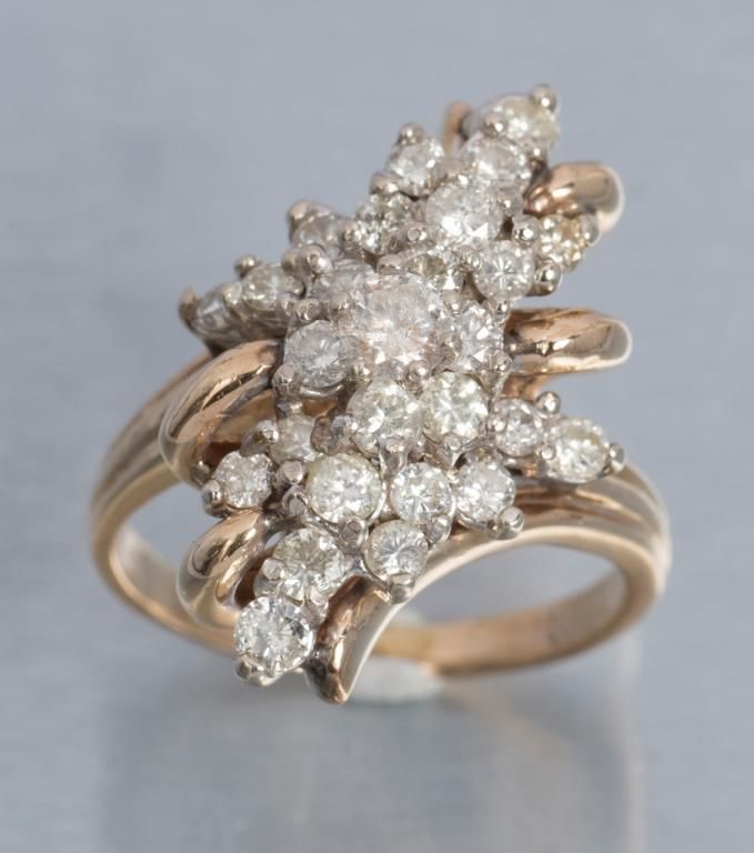 One 14 k yellow gold ladies diamond cluster ring with 27 fine quality diamonds weighing approx. 2 cts. Est. $2,000 - $2,500