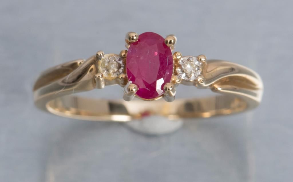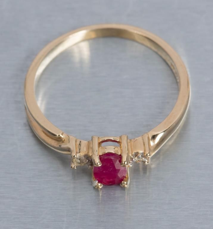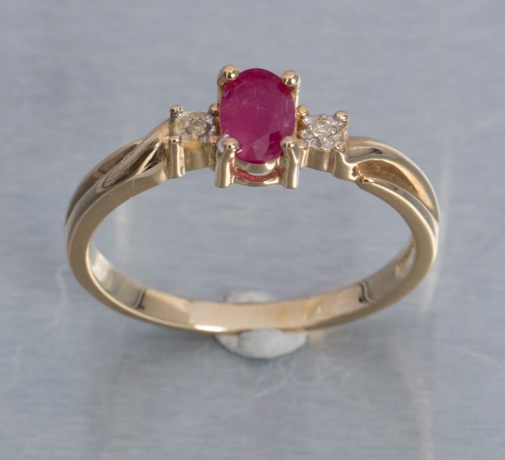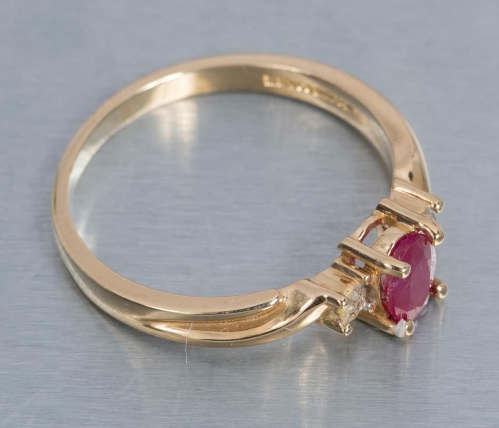 One 14 k yellow gold ring set with oval ruby and diamonds. Est.: $150 - $200