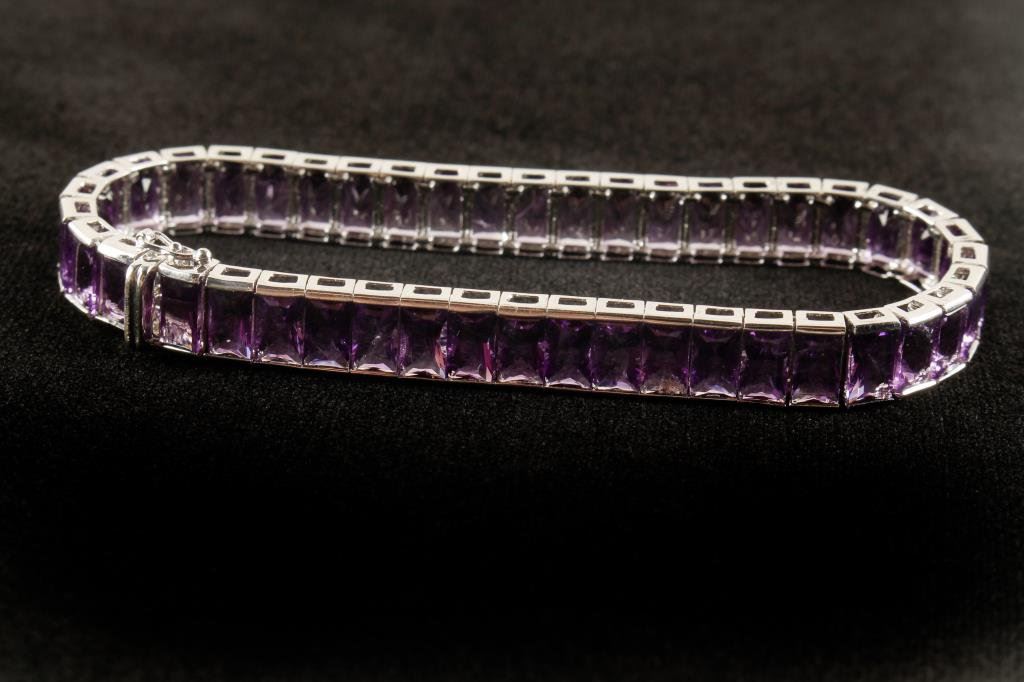 One 14k white gold bracelet set with rectangular amethysts. 44 amethysts weighing 36.20ct Est. Retail Value $1300-1800