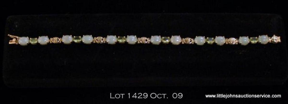 One 14k yellow gold bracelet set with 12 oval green jade 9 x 6 mm weighing approx. 20 grams and 6 oval peridot 6 x 4 mm weighing 3.2 ct. bracelet wt 9.66 grams. Est. $350 - 600