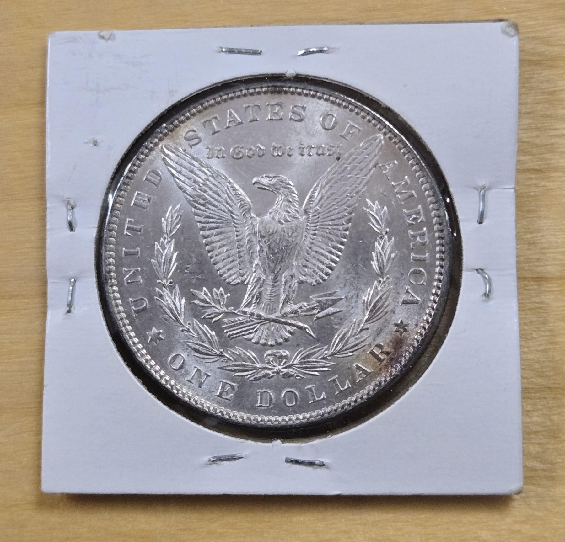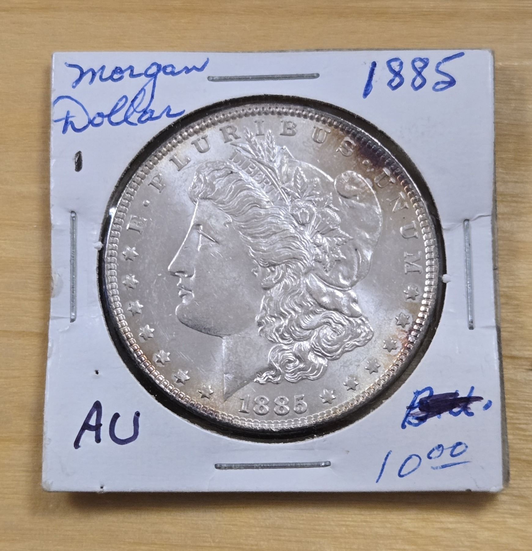 One 1885 American Silver Morgan Dollar. Coin is 900 silver. Grade is AU.