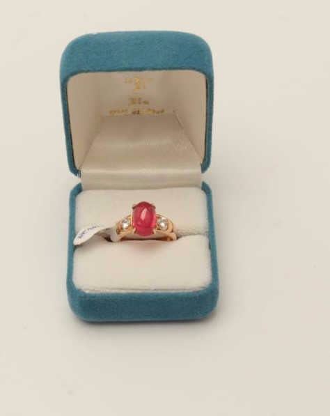 One 18k rose gold ladies ring set with a Burmese ruby cabochon weighing approx 5 ct and 2 side diamond. EST.$1,000-1,500