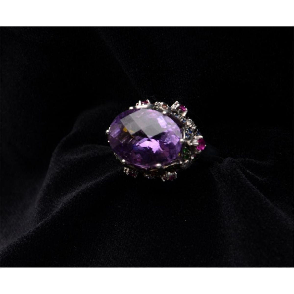 One 18k white gold art deco type ring set with a large checkerboard cut amethyst and accented by rubies, diamonds, sapphires and emeralds. Est.: $800-$1,600