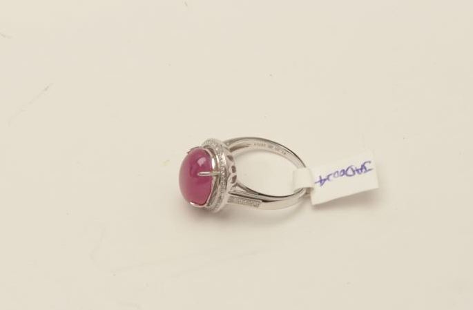 One 18k white halo gold ladies ring set with a Burmese ruby cabochon weighing approx 6 ct EST.$1,000-2,000