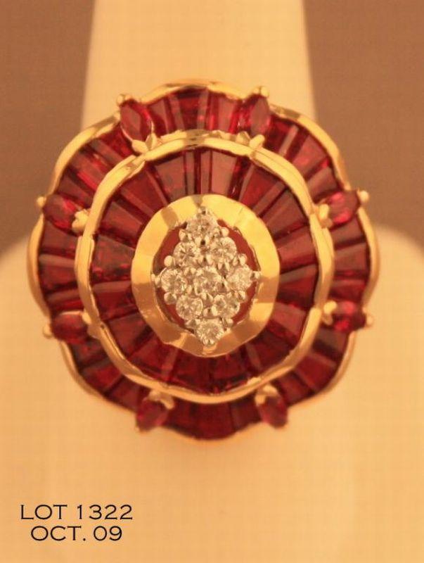 One 18k yellow gold ladies ring set with 0.20ct of diamonds and 8.00ct of baguette and marquee rubies. Est. $15,000-$22,000.