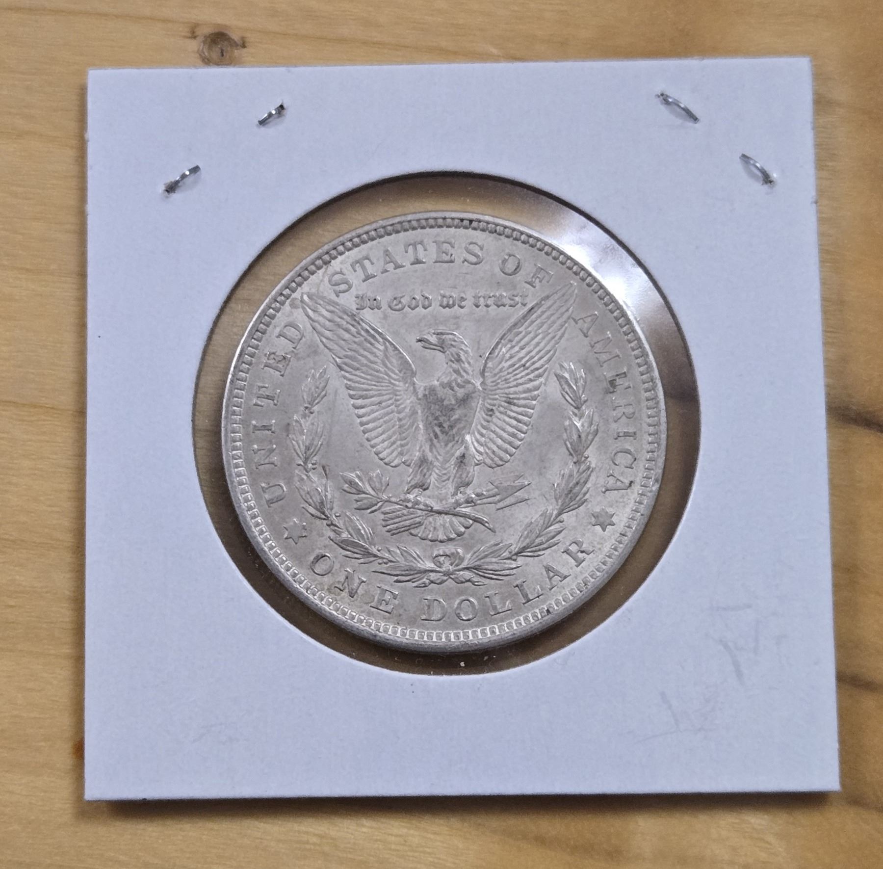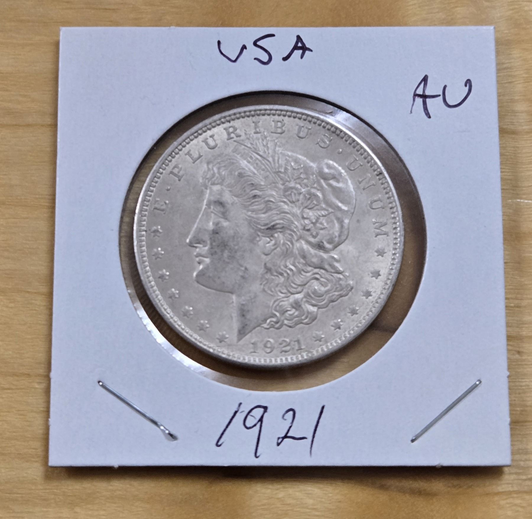 One 1921 American Silver Morgan Dollar. Coin is 900 silver. Grade is AU. Note card is 2.5” by 2.5”.