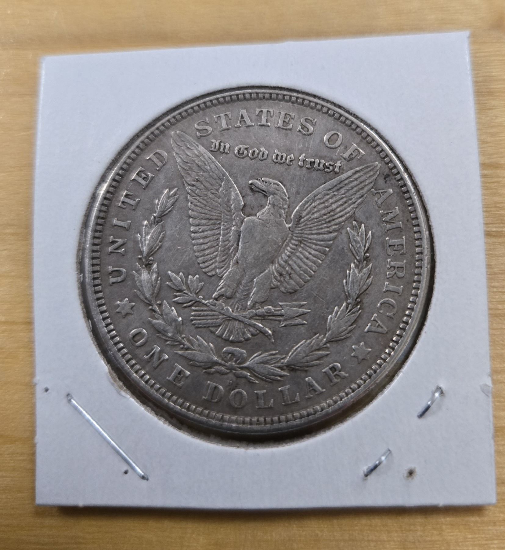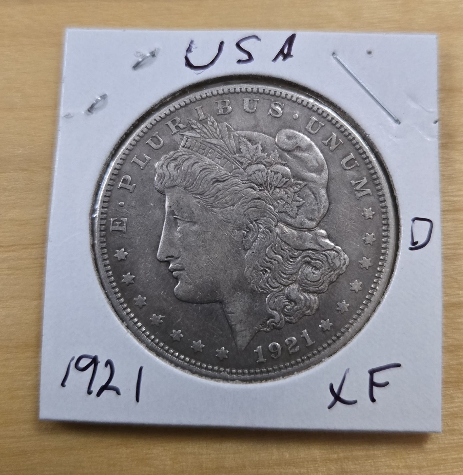 One 1921 American Silver Morgan Dollar. Coin is 900 silver and marked Denver mint. Grade is XF.