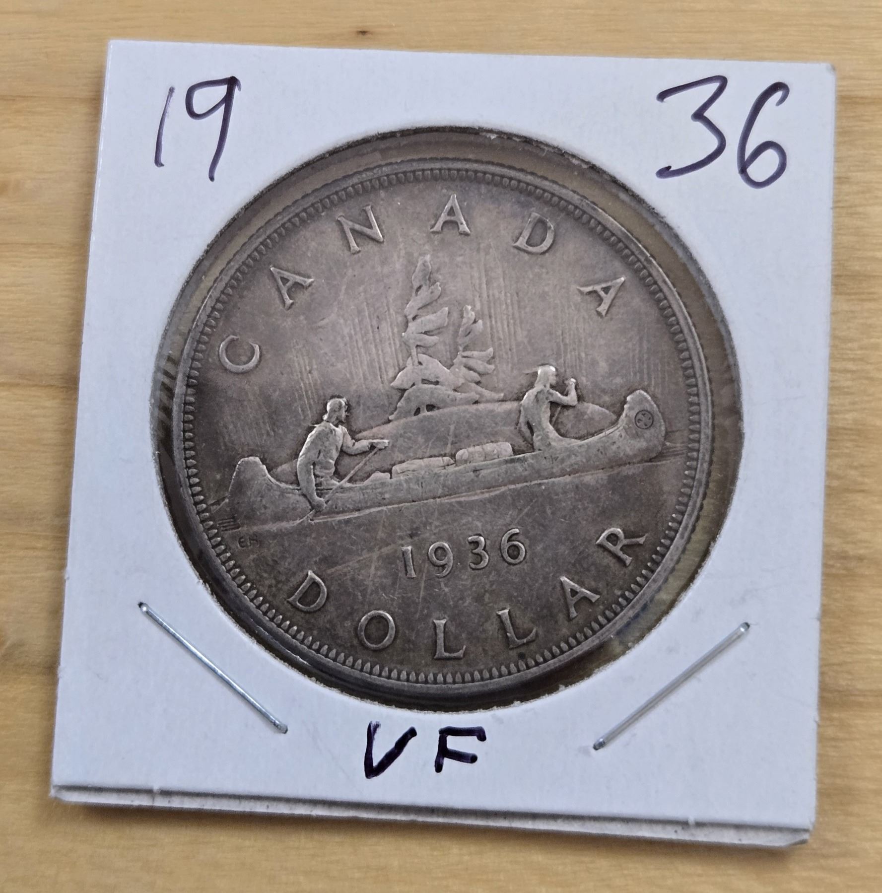 One 1936 Canadian Silver Dollar. Coin is 800 silver. Grade is VF.