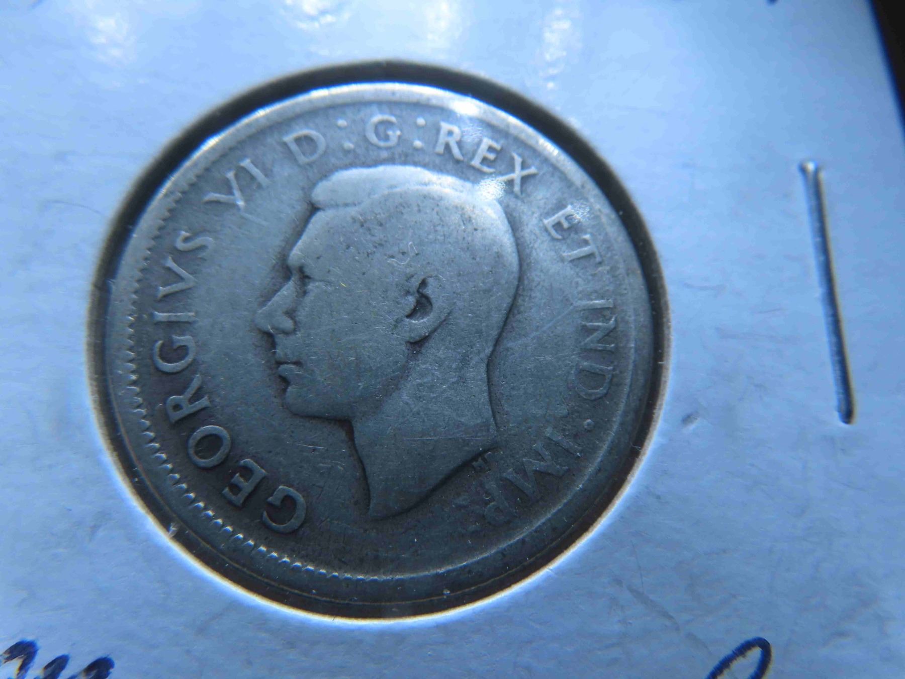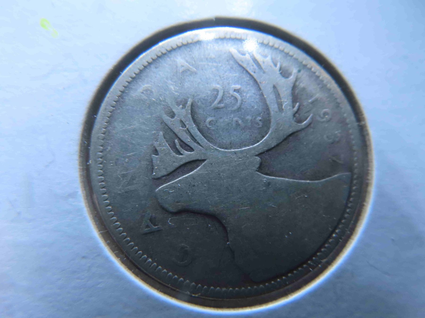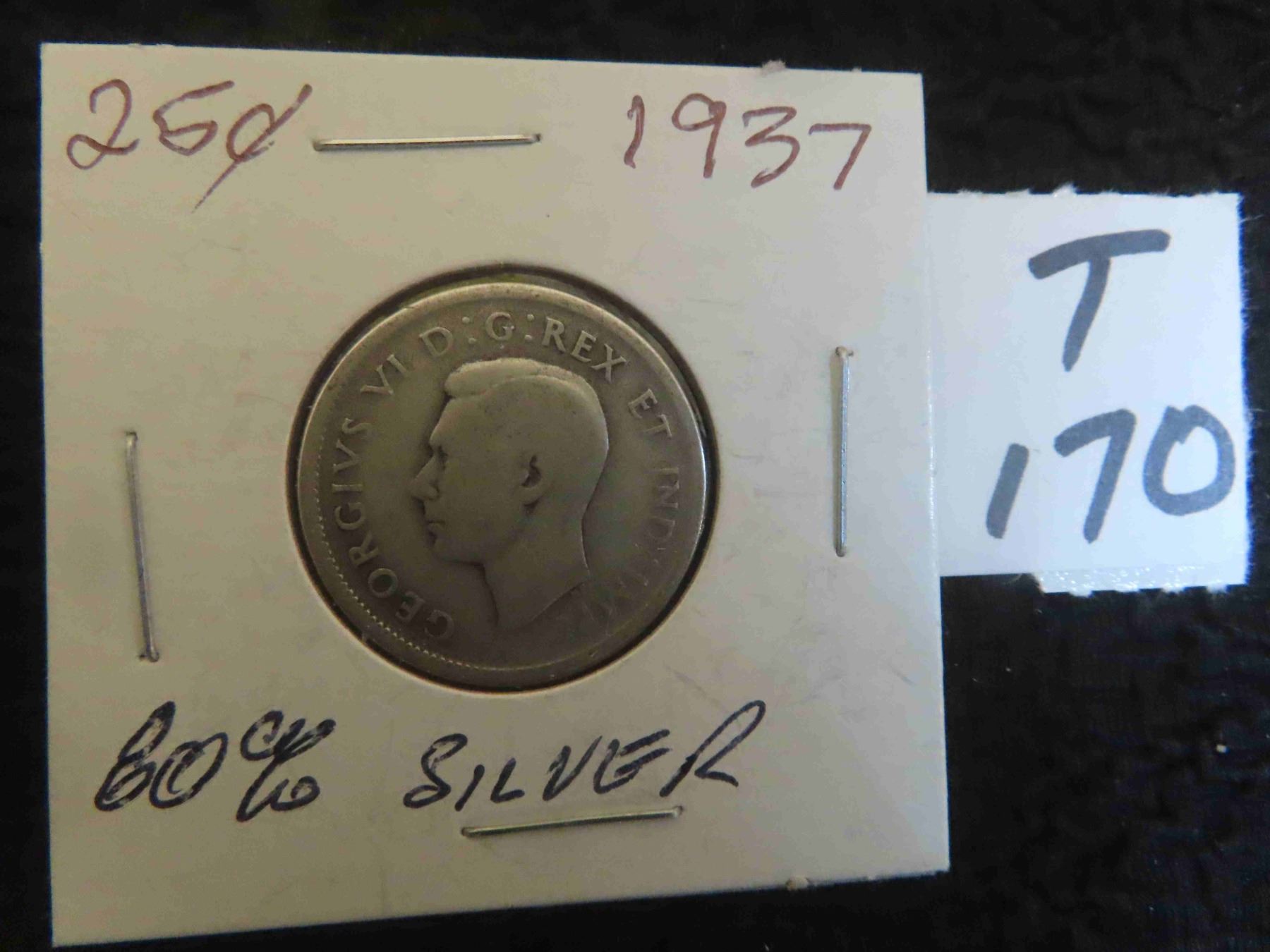 One 1937 Canadian 80% silver 25 cent coin, circulated, ungraded.