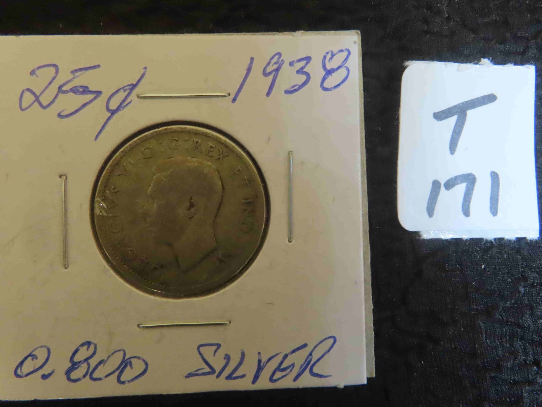 One 1938 Canadian 80% silver 25 cent coin, circulated, ungraded.