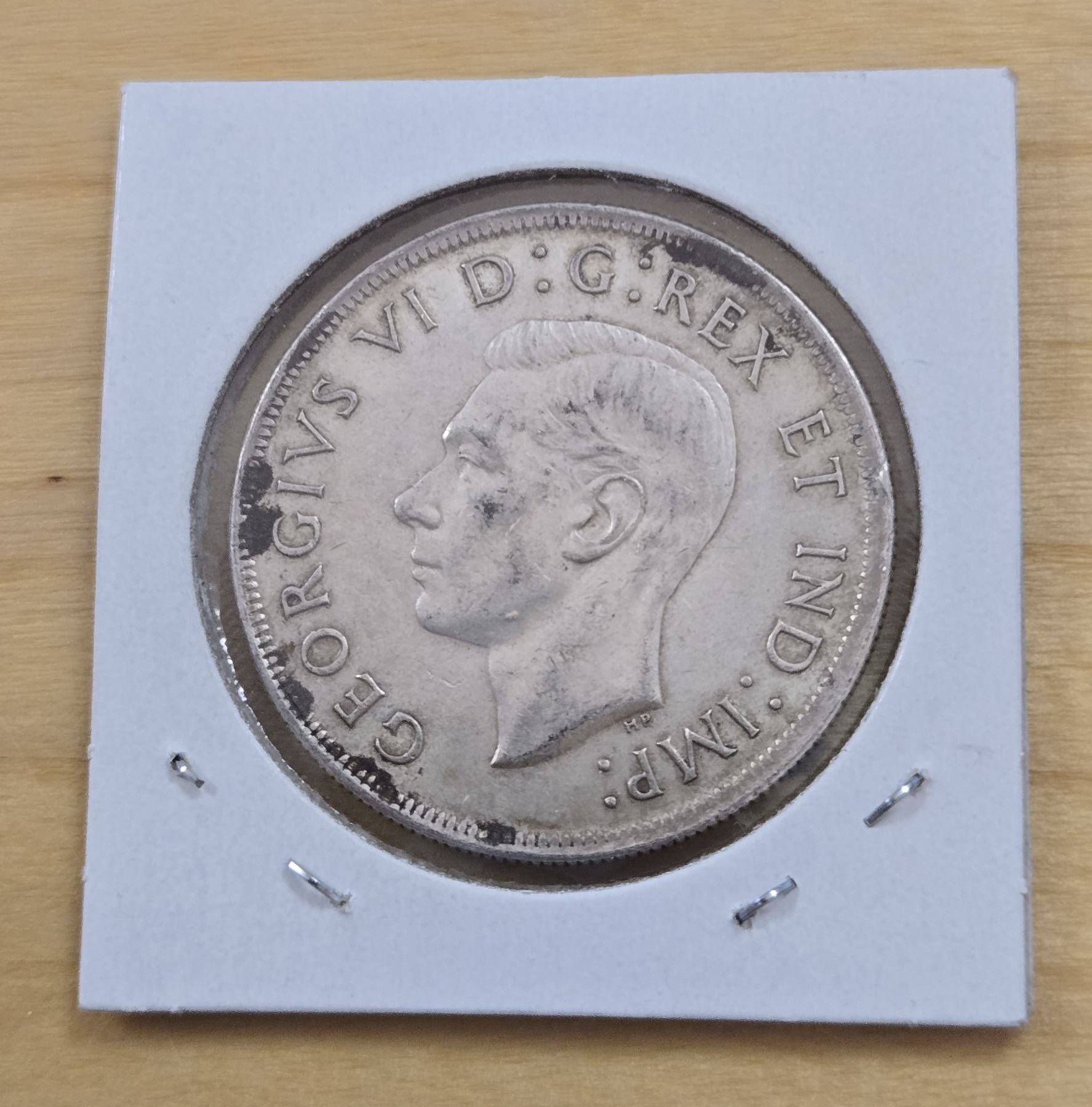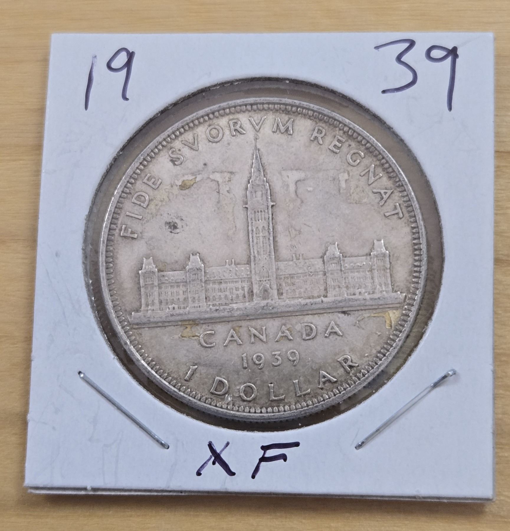 One 1939 Canadian Silver Dollar. Coin is 800 silver. Grade is XF.