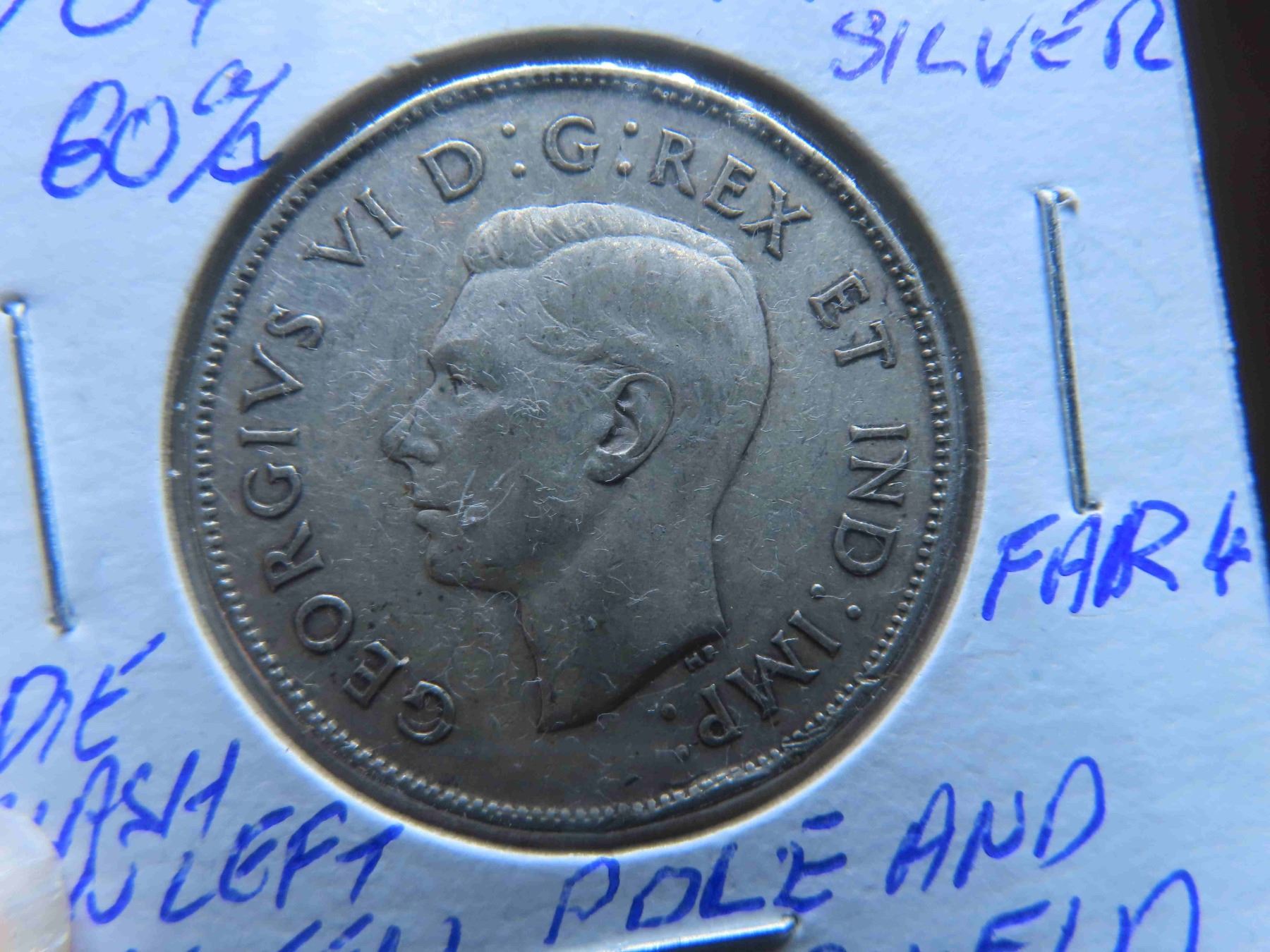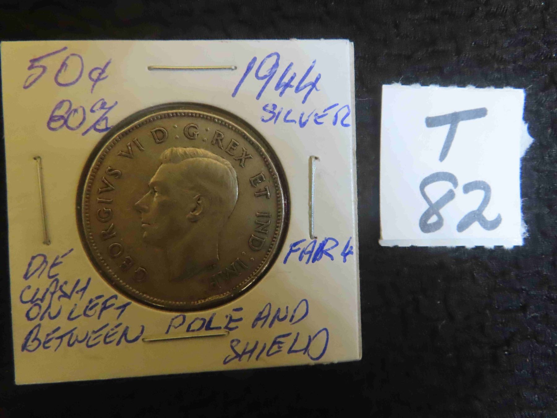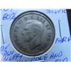 One 1944 Canadian 50 cent piece, 80% silver, Far 4, die clash on left between pole and shield