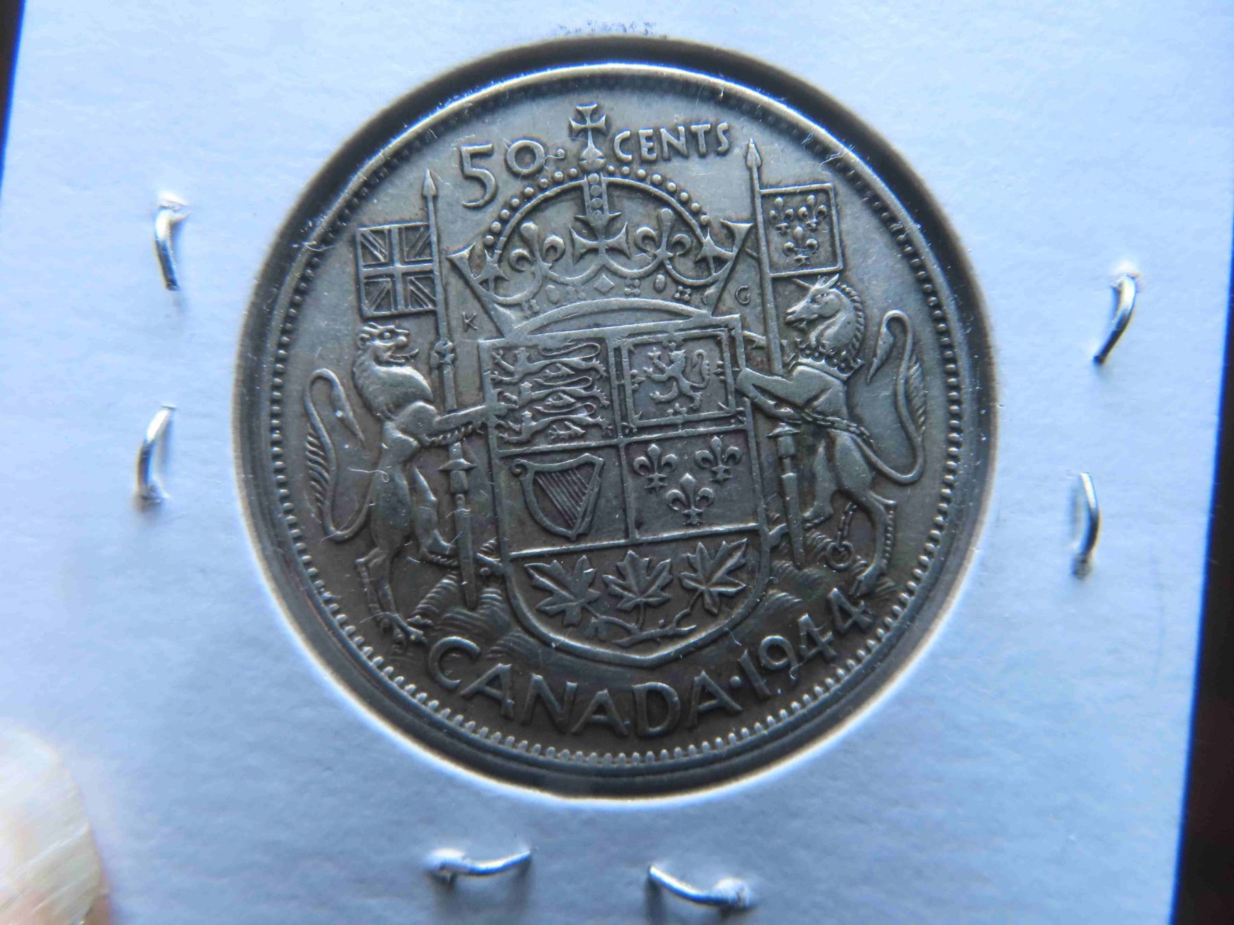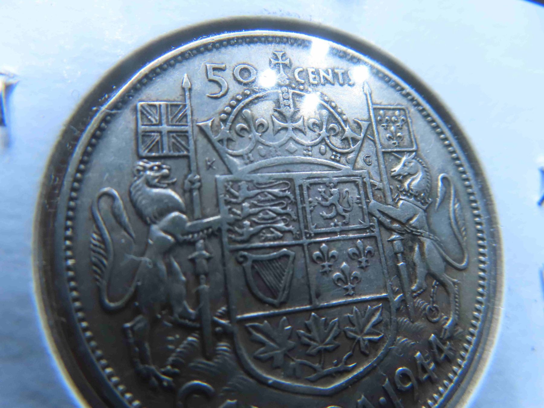 One 1944 Canadian 50 cent piece, 80% silver, Far 4, die clash on left between pole and shield under lions outstretched leg, circulated and ungraded