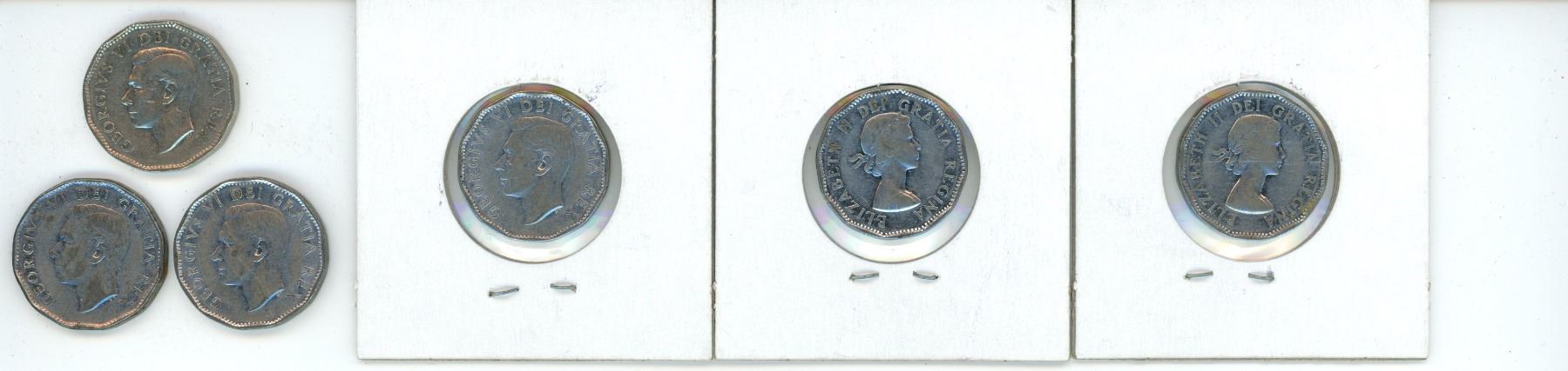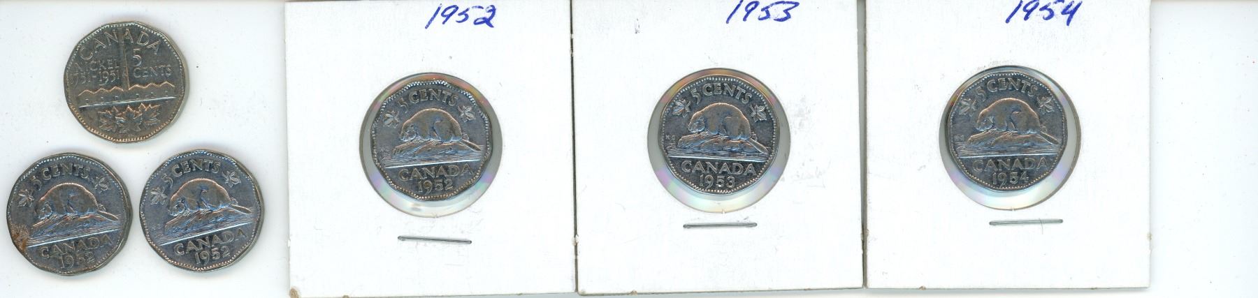 One 1951, Three 1952, One 1953 and One 1954 Canadian 5 Cent Coins