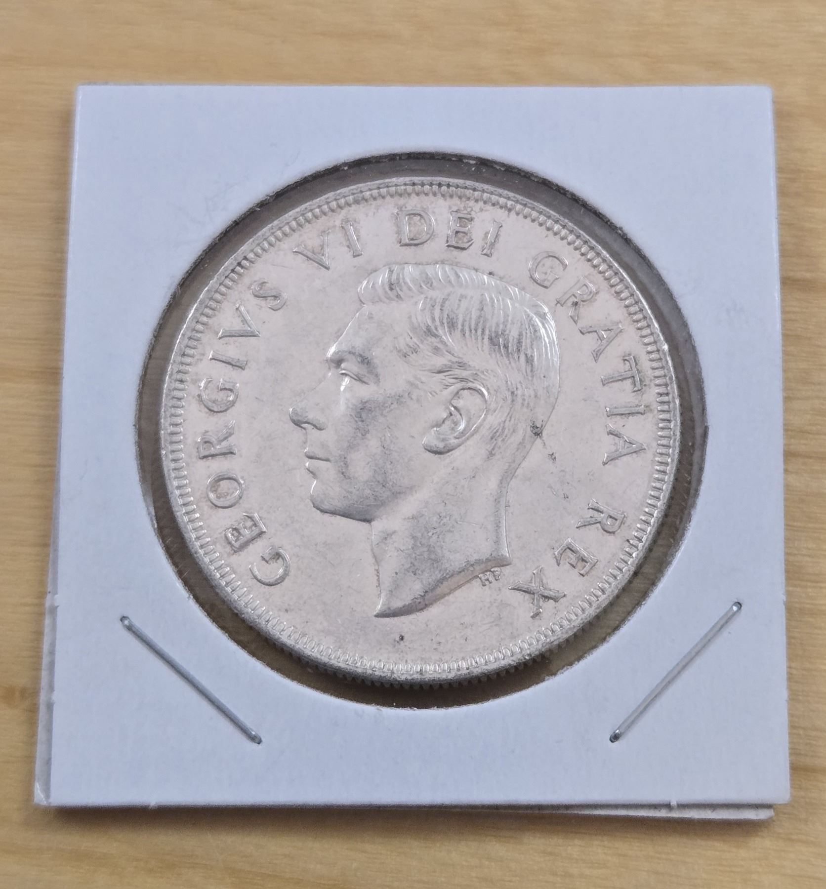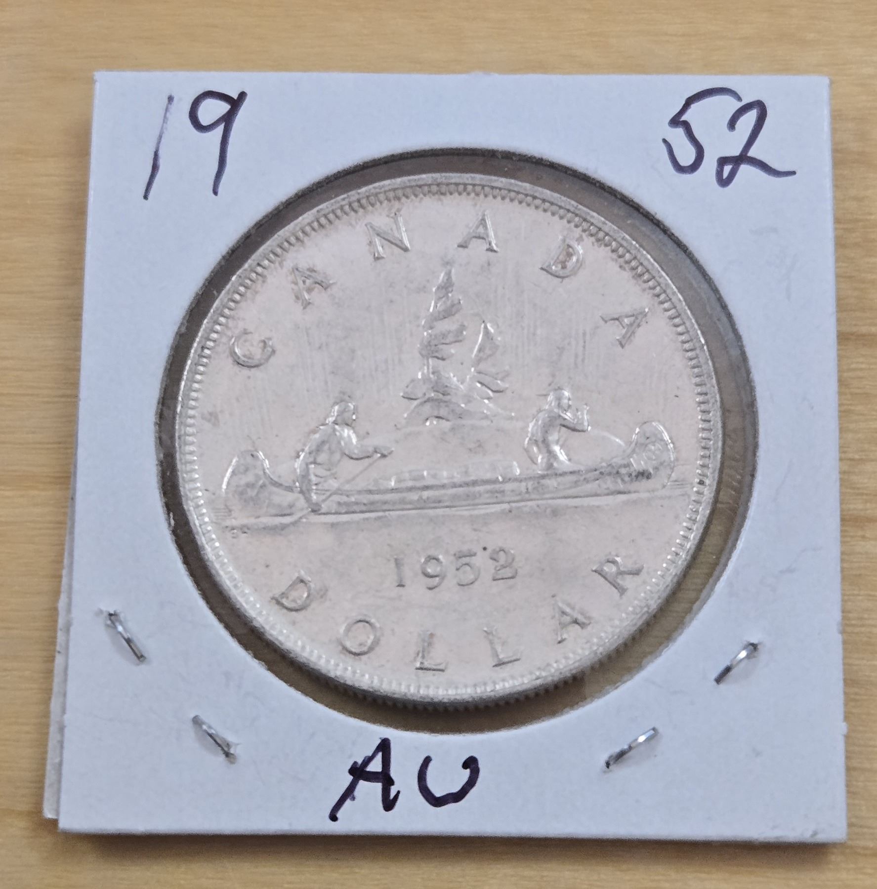 One 1952 Canadian Silver Dollar. Coin is 800 silver. Grade is AU.