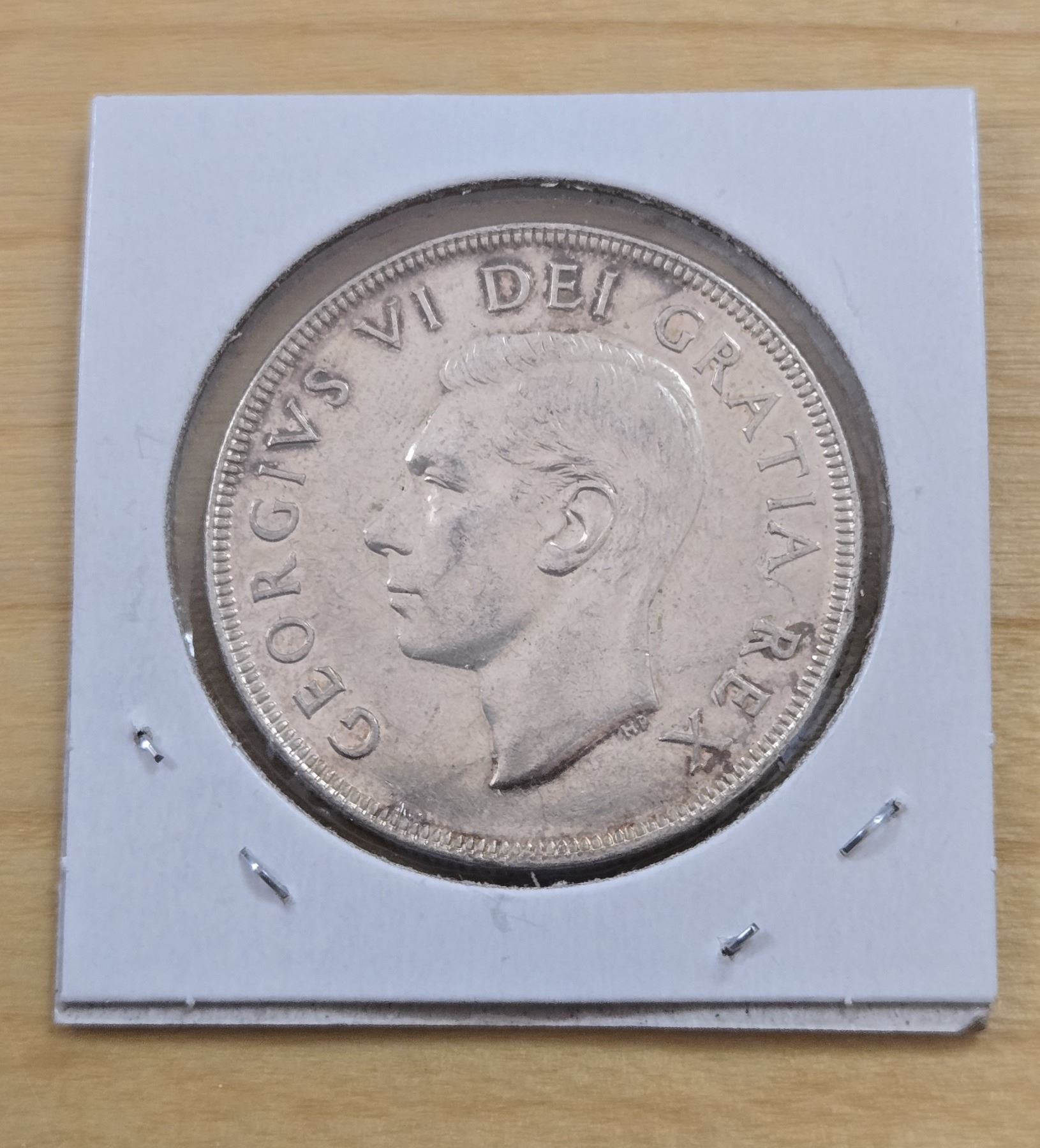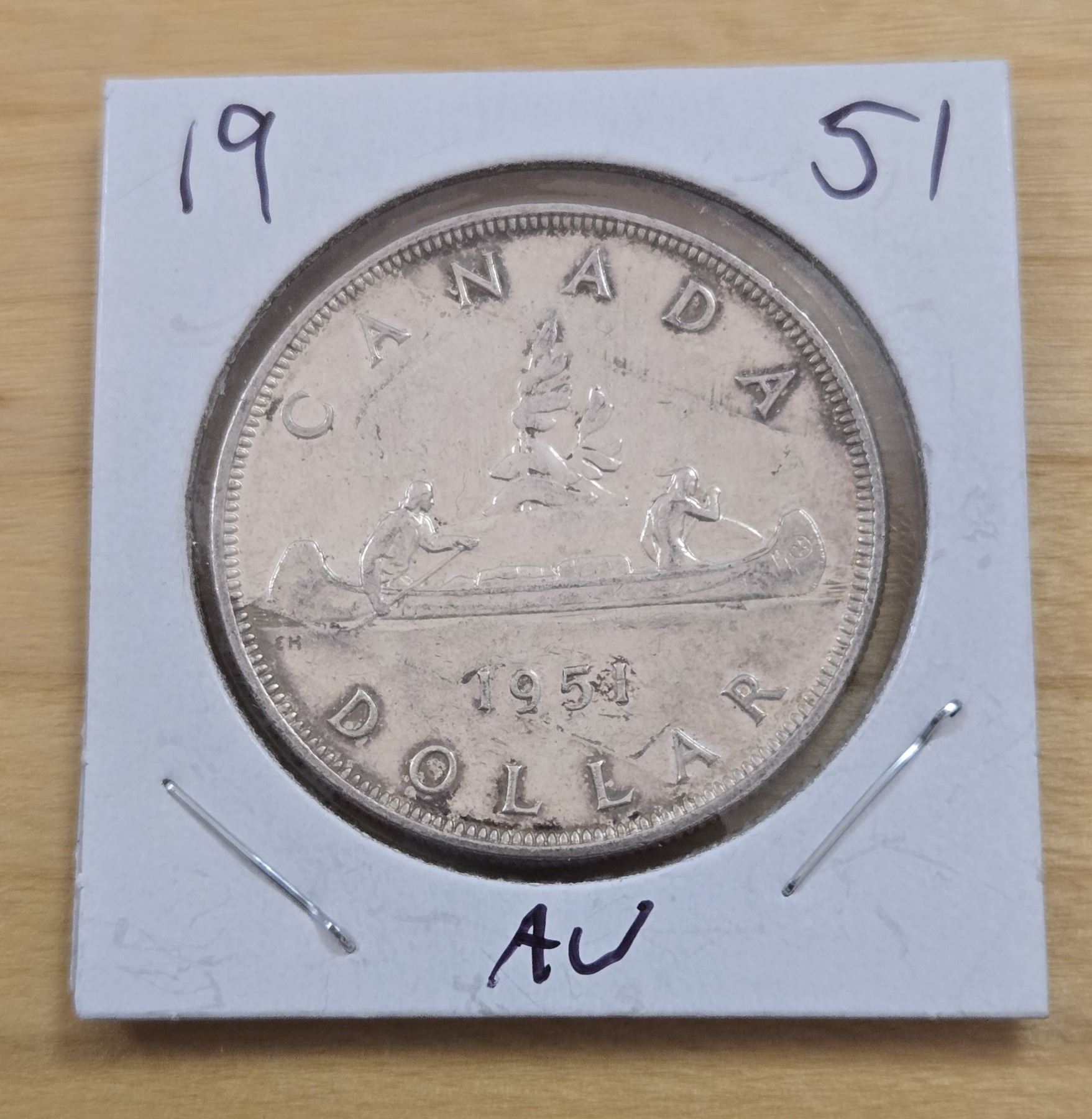One 1954 Canadian Silver Dollar. Coin is 800 silver. Grade is AU.