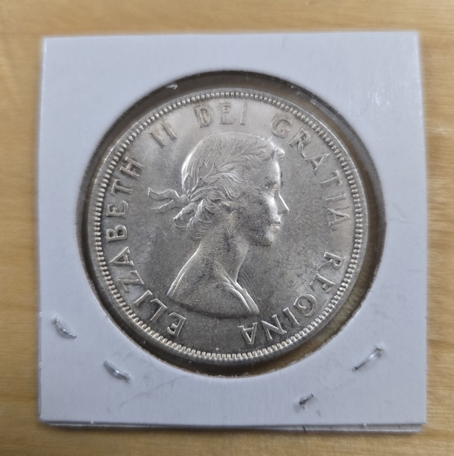 One 1958 Canadian “Totem” Silver Dollar. Coin is 800 silver. Grade is MS.