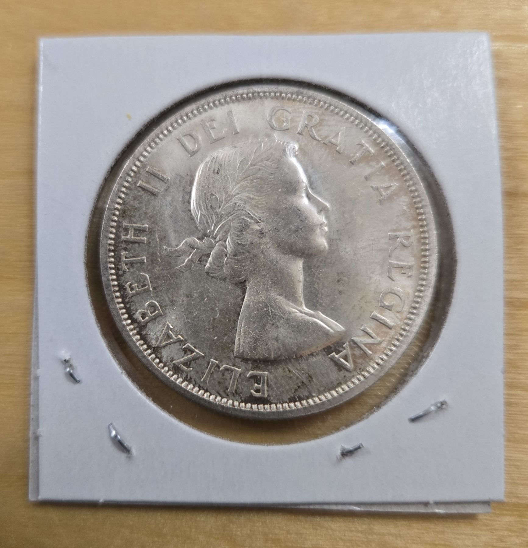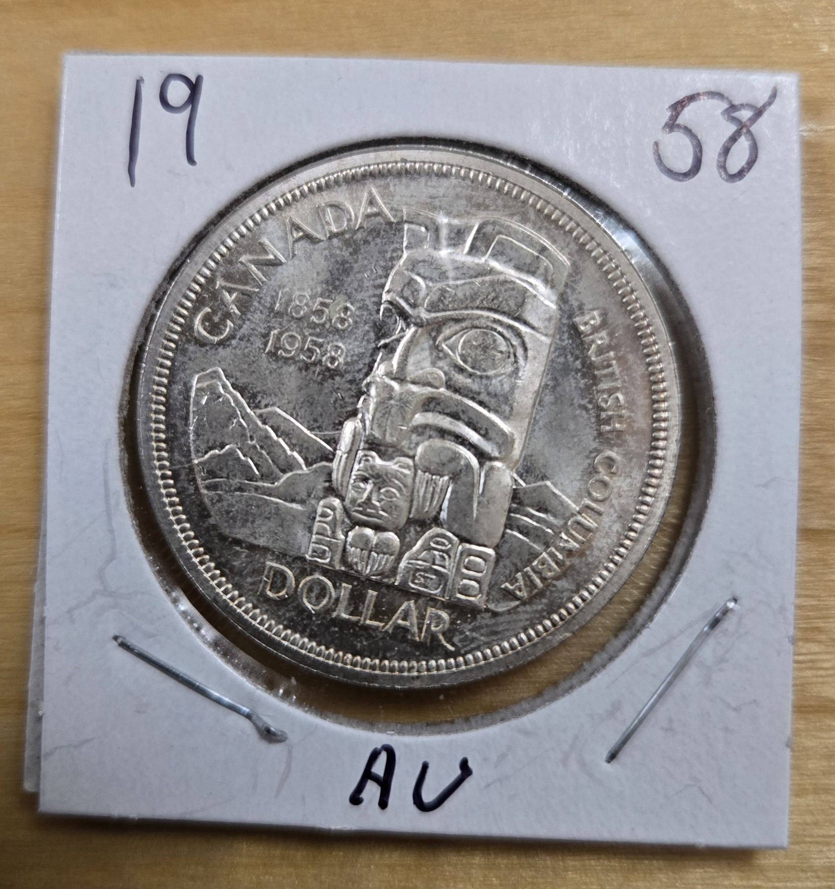 One 1958 Canadian “Totem” Silver Dollar. Coin is 800 silver. Grade is AU.