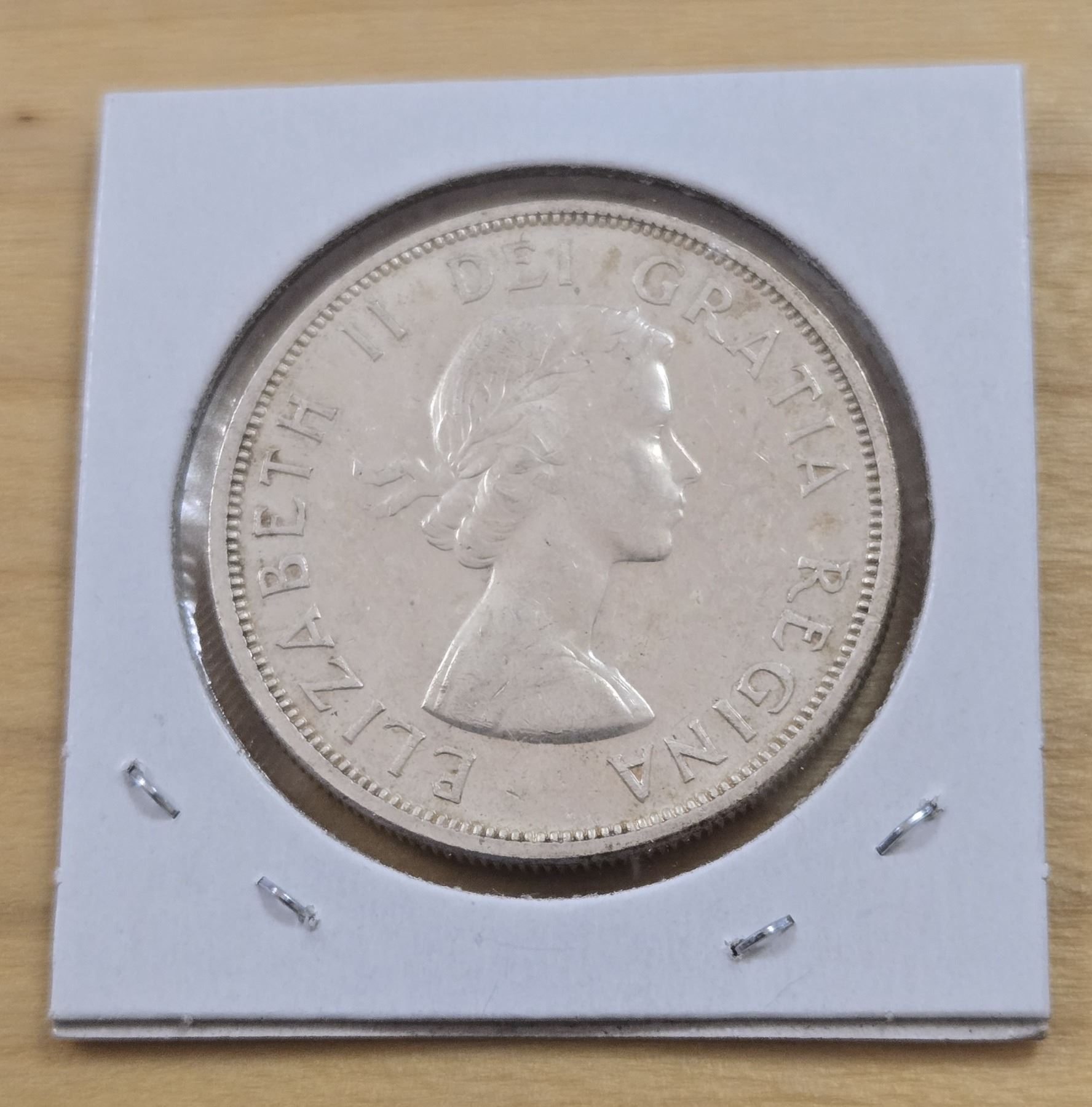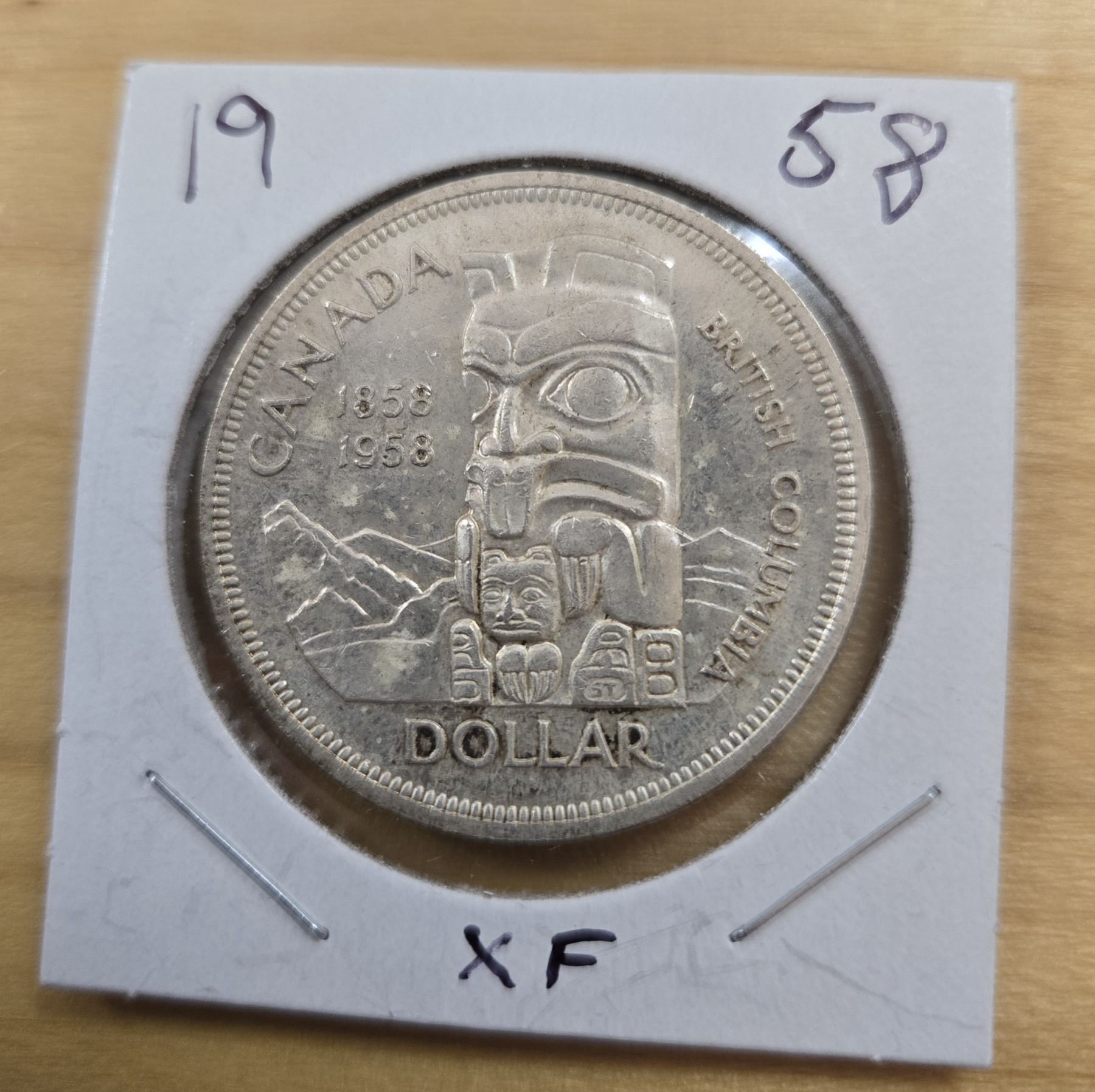 One 1958 Canadian “Totem” Silver Dollar. Coin is 800 silver. Grade is XF.