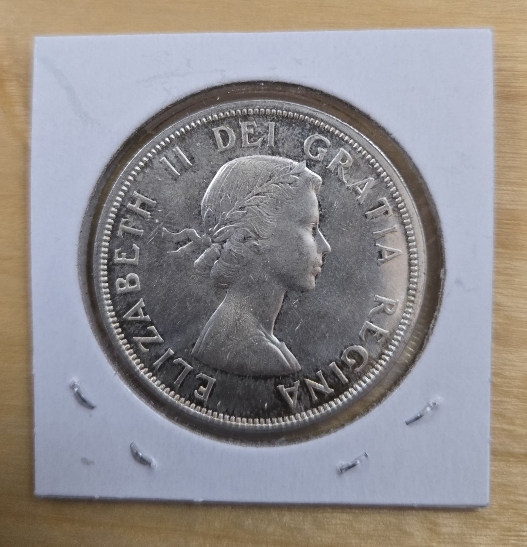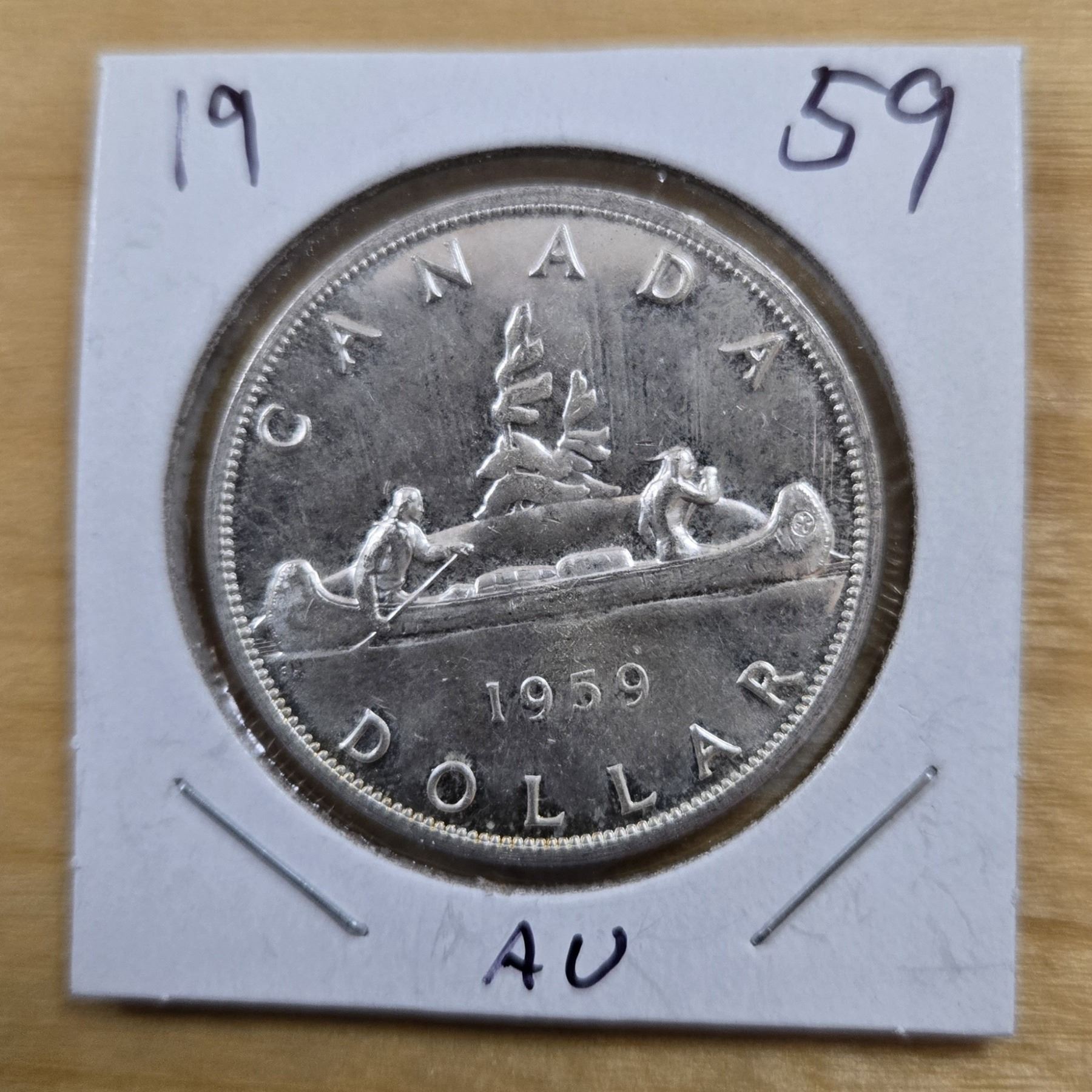 One 1959 Canadian Silver Dollar. Coin is 800 silver. Grade is XF.