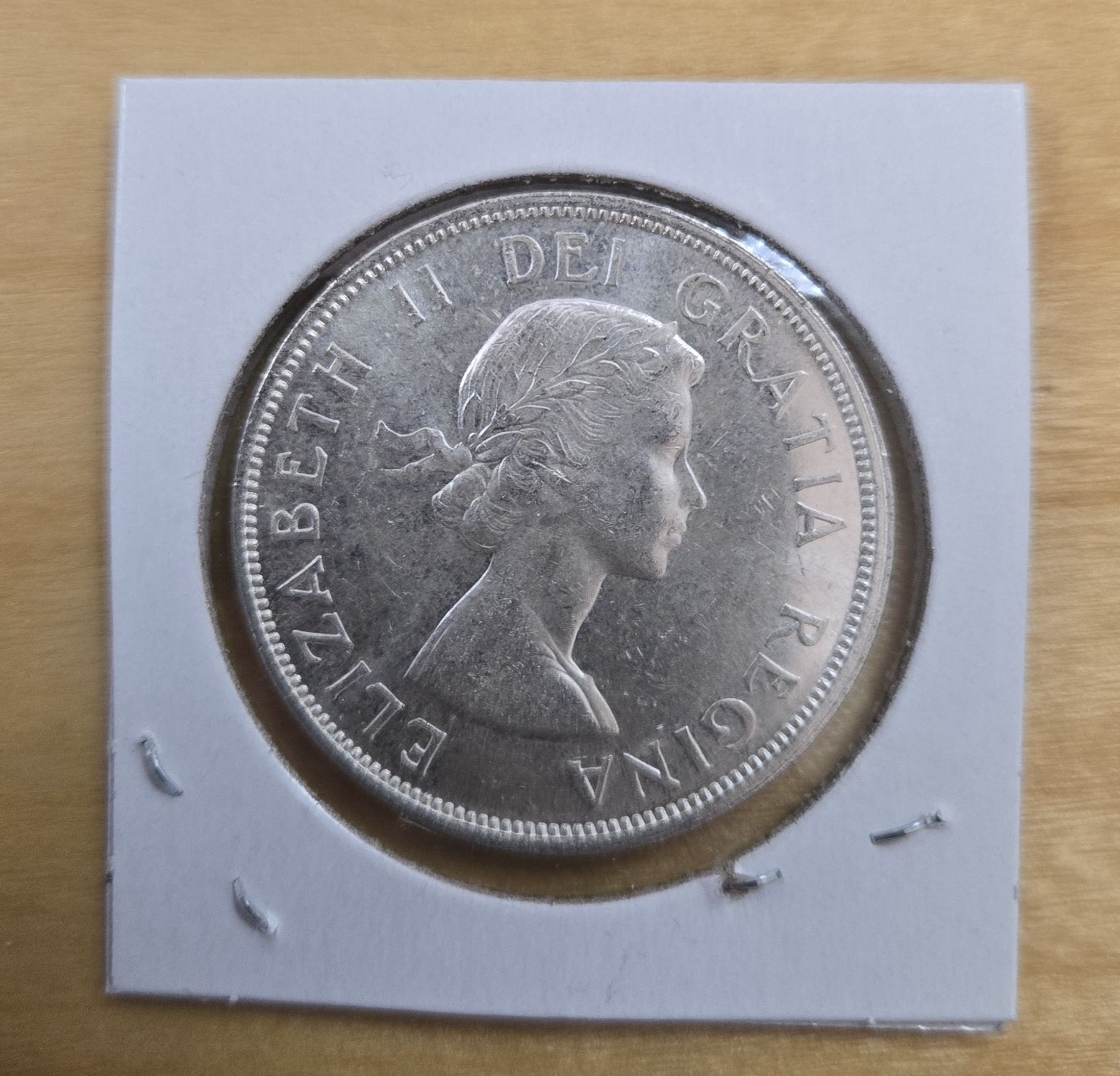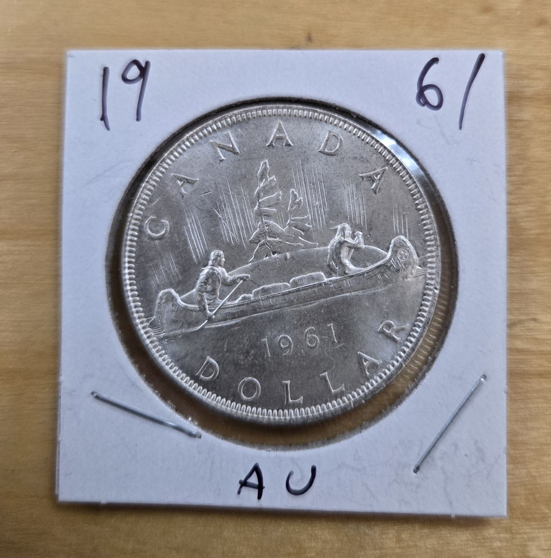One 1961 Canadian Silver Dollar. Coin is 800 silver. Grade is AU.