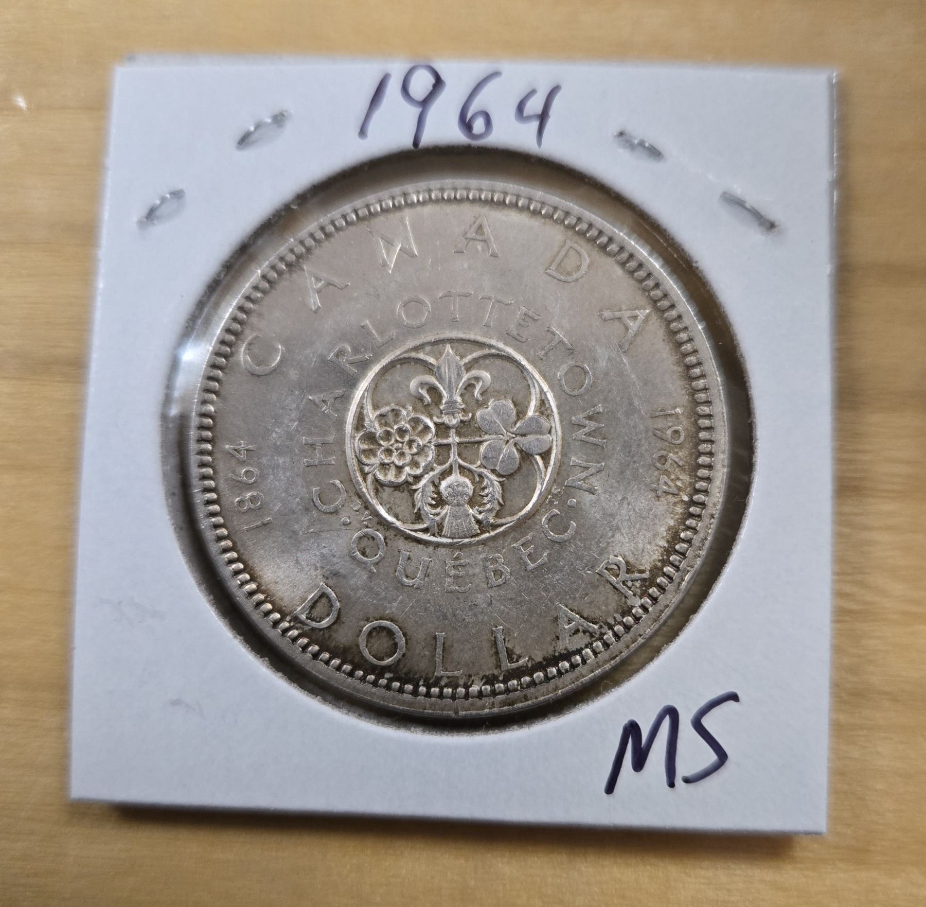 One 1964 Canadian “Quebec Charlottetown” Silver Dollar. Coin are 800 silver. Grade is MS.