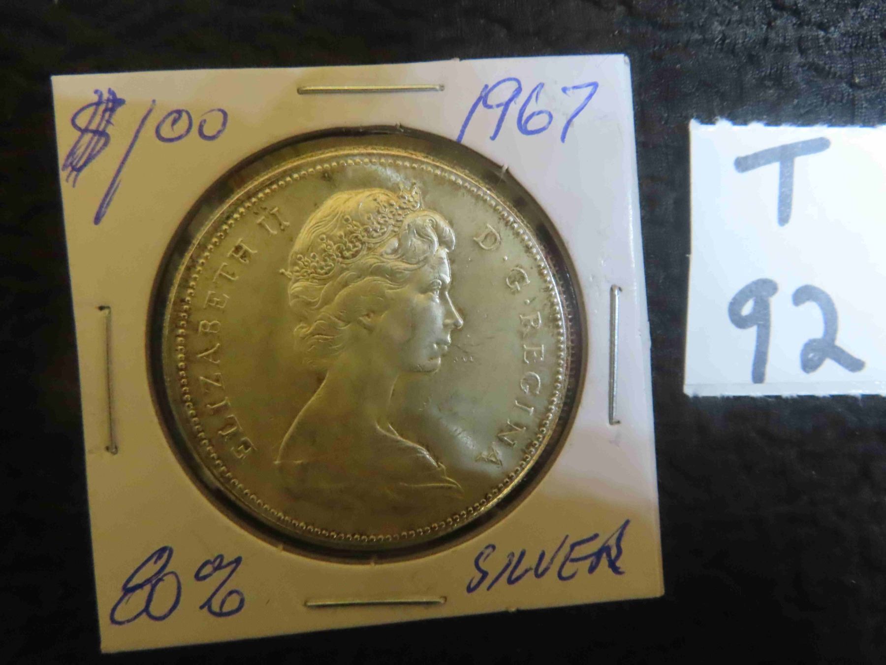 One 1967 Canadian 80% silver dollar, circulated and ungraded.