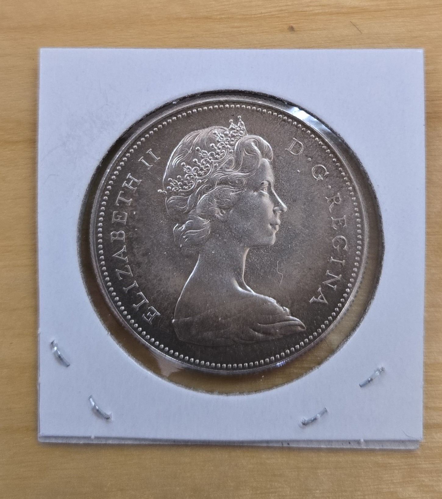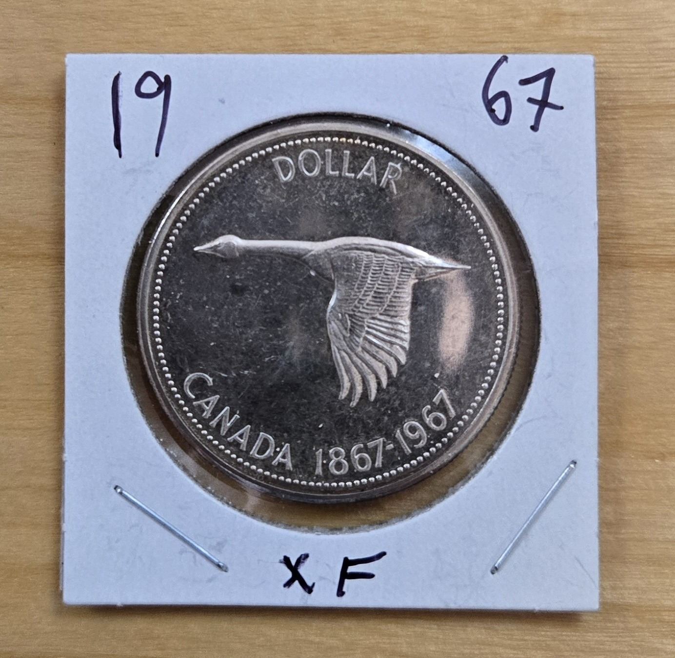 One 1967 Canadian “Centennial” Silver Dollar. Coin is 800 silver. Grade is XF.