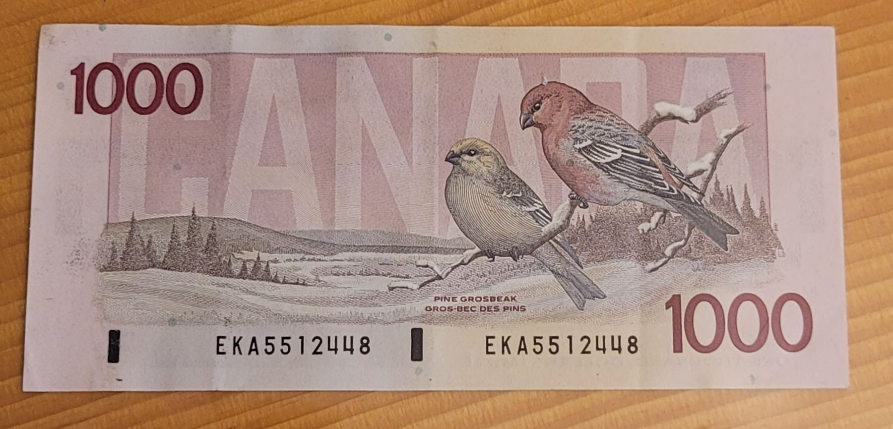 Clear, crisp and uncirculated. Serial number EKA5512448. Signed by Bonin and Thiessen.