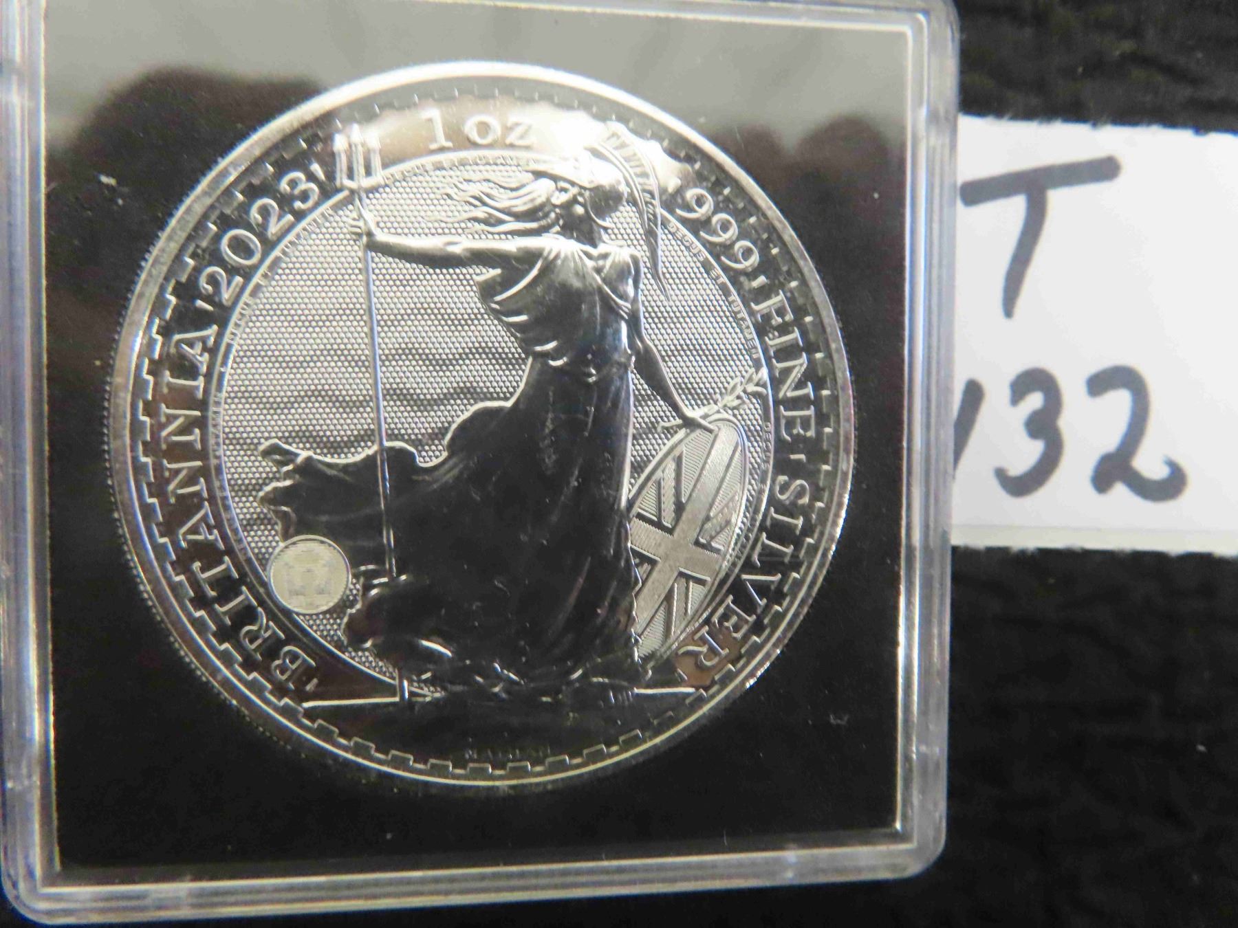 One 2023, British 2 GBP, 999 fine silver round, 1 troy ounce, sealed in capsule, untouched