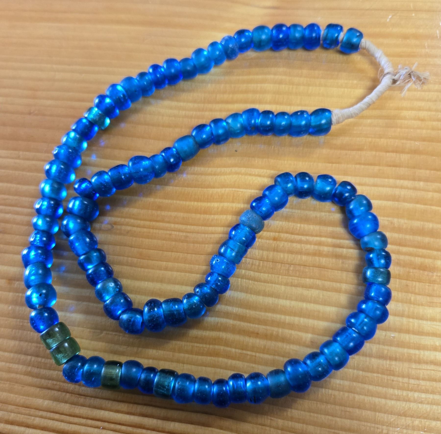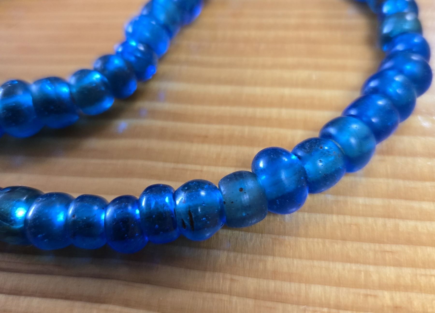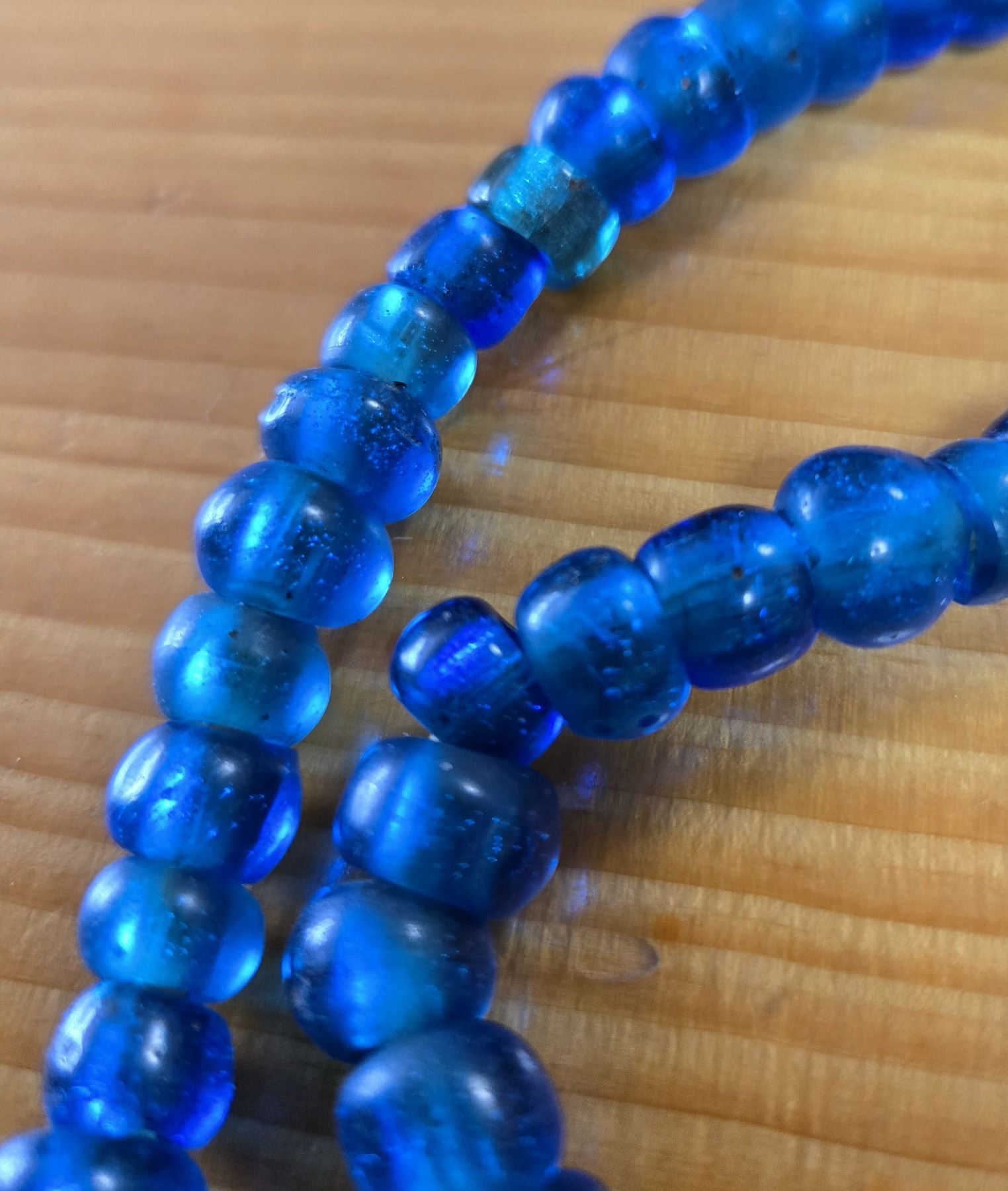 One 24” Strand of Antique Translucent Blue Padre Beads. Each bead measures 6 mm to 11mm in diameter.