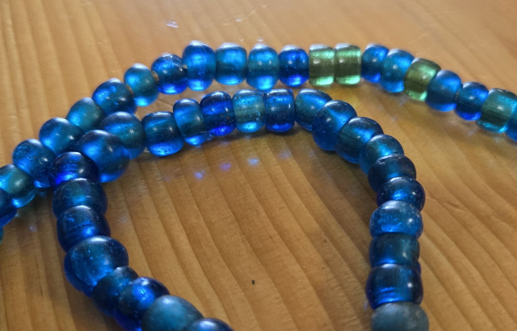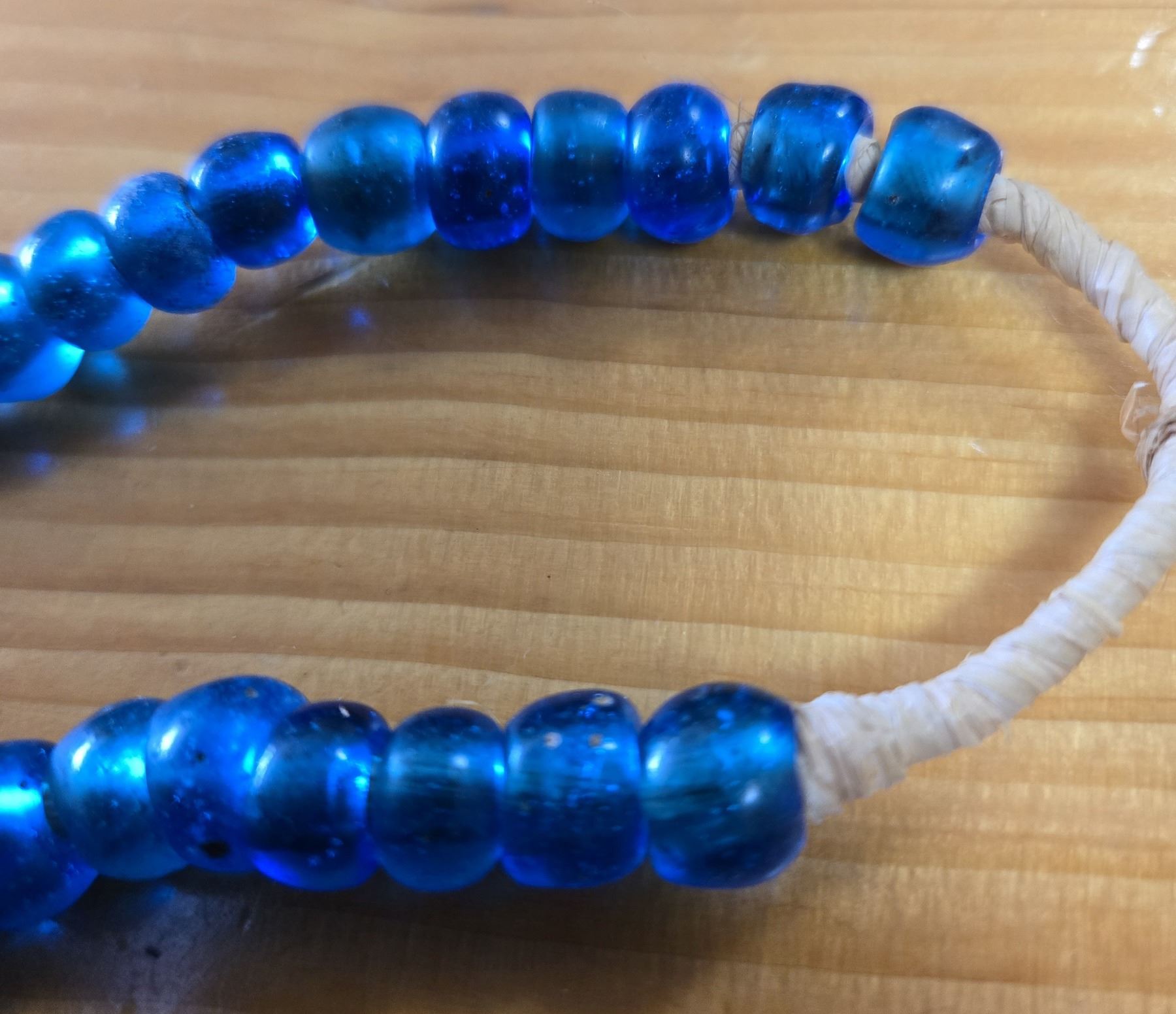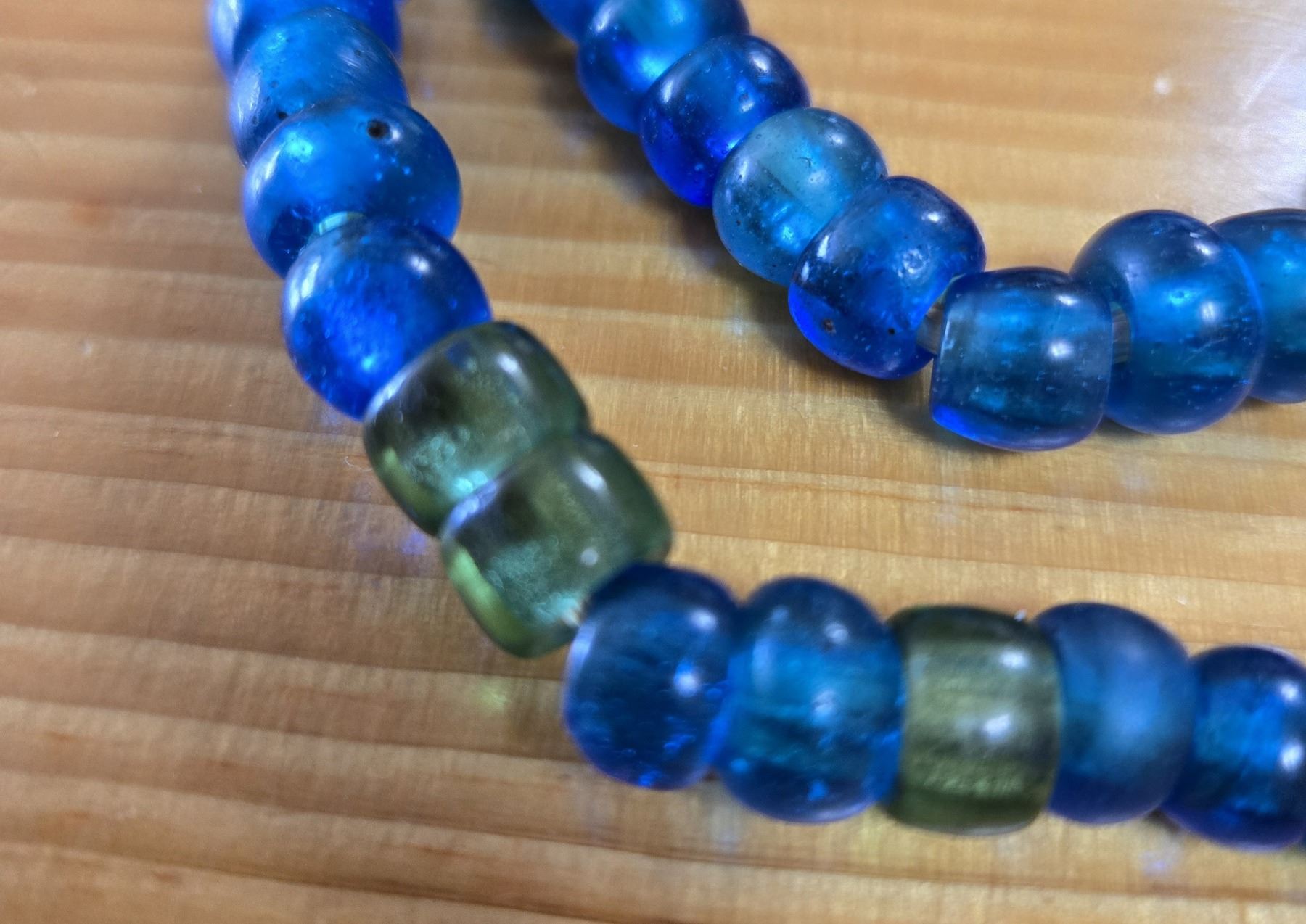 One 24” Strand of Antique Translucent Blue Padre Beads. Each bead measures 6 mm to 11mm in diameter.