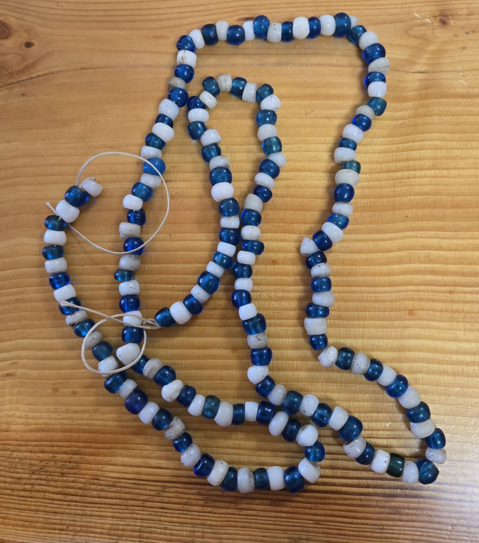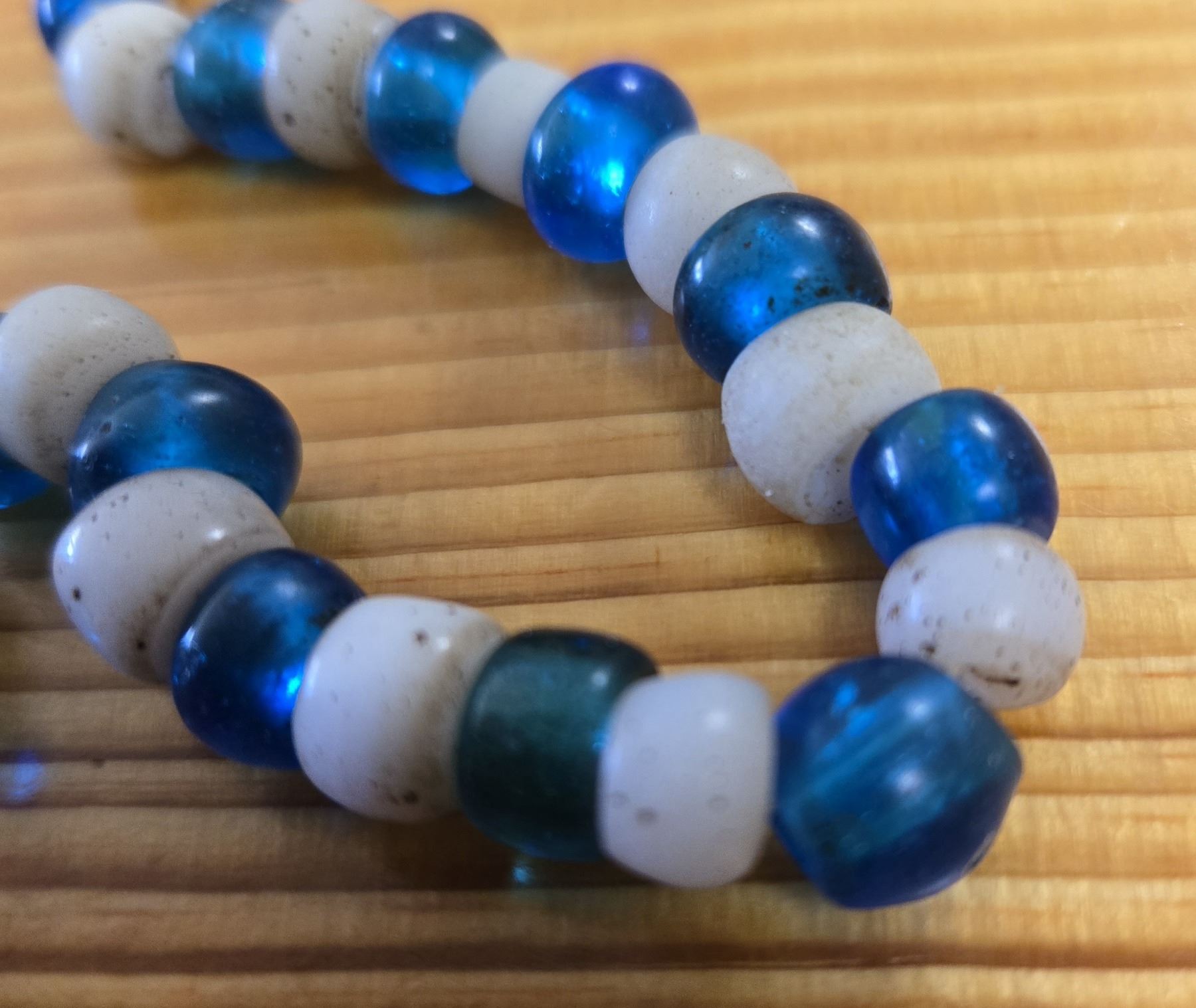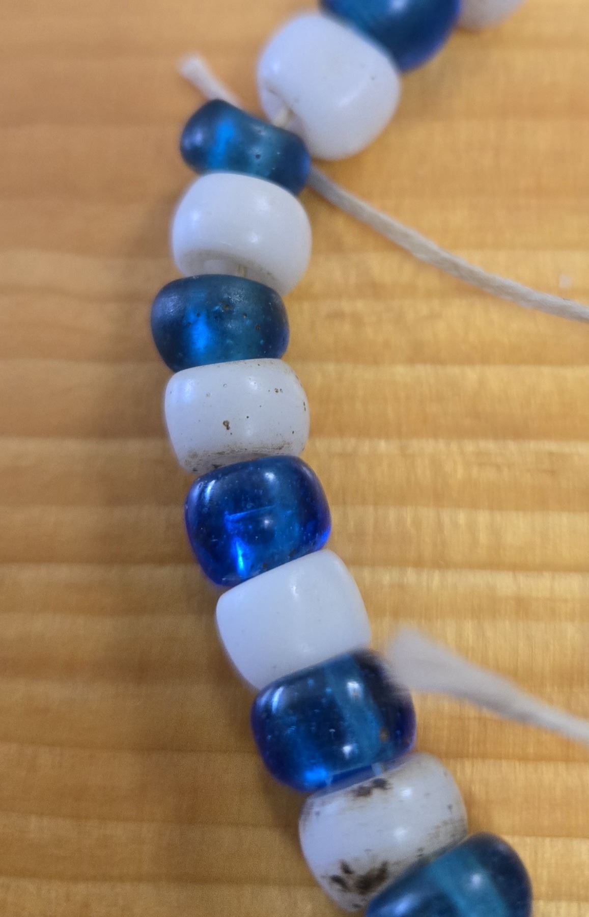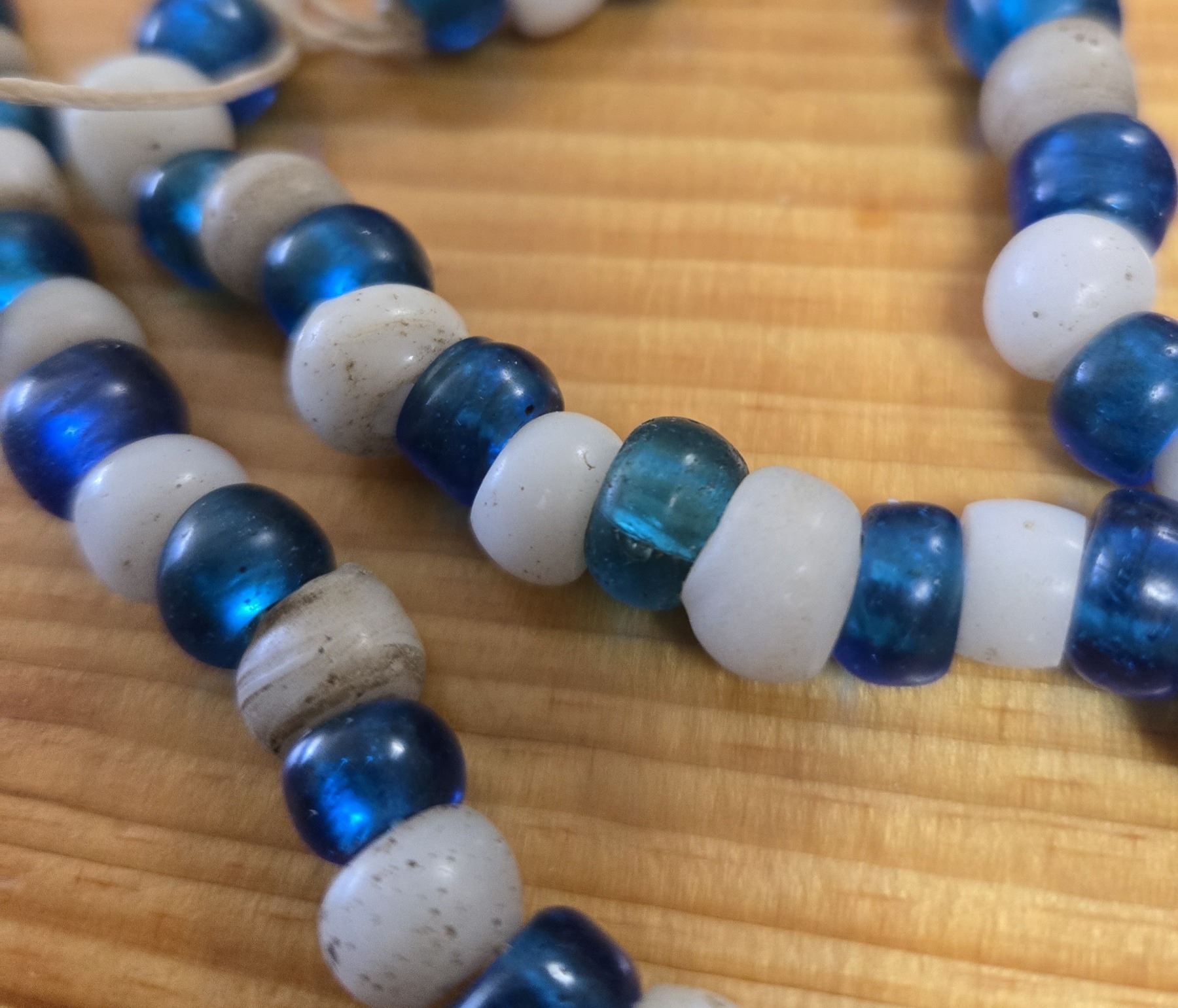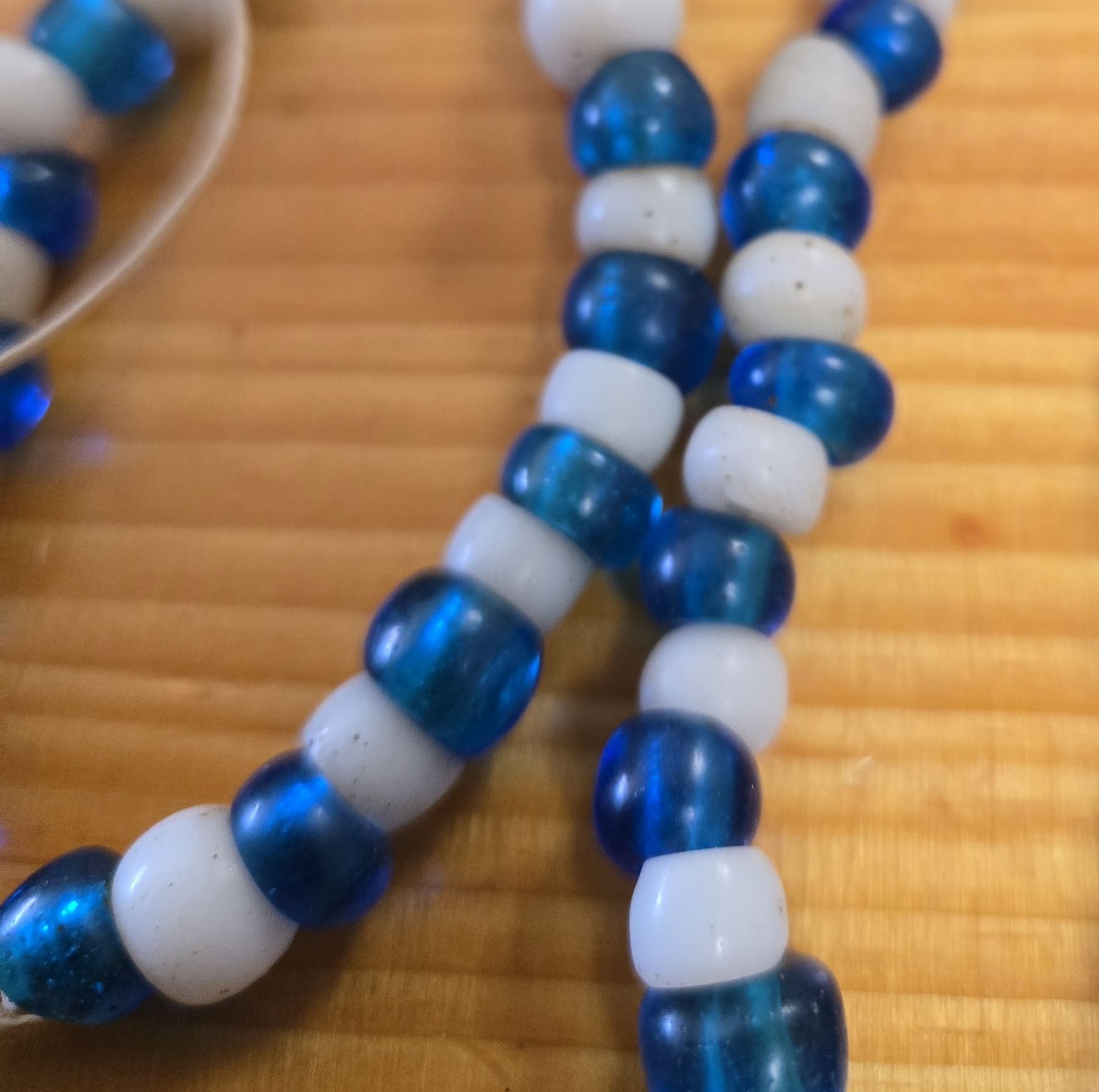 One 42” Antique Opaque White and Translucent Blue Venetian Padre Beads. Each bead measures 8 to 10 mm in diameter.