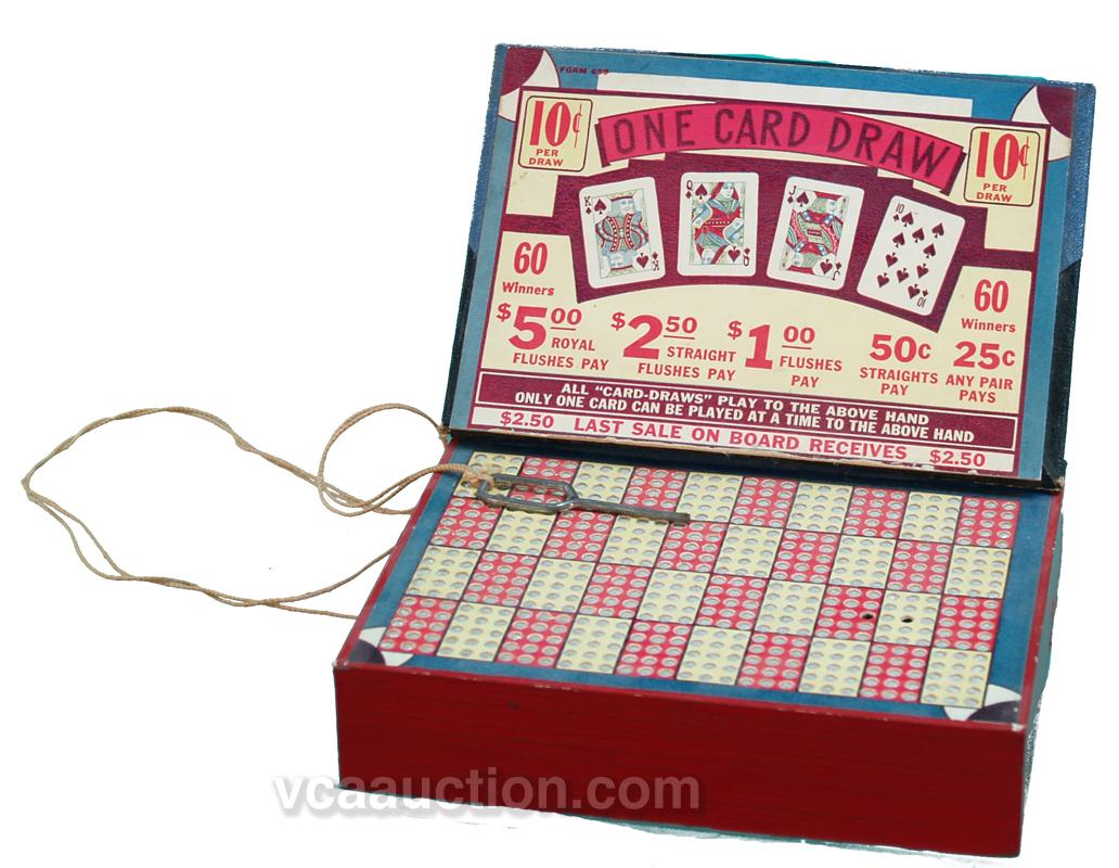 One Card Draw Sneak Punch Board. Looks like a Bible when closed. A few holes are punched, metal puncher on string, excellent condition; measures 6-1/2" x 5-1/2"; c1930 - 1950.