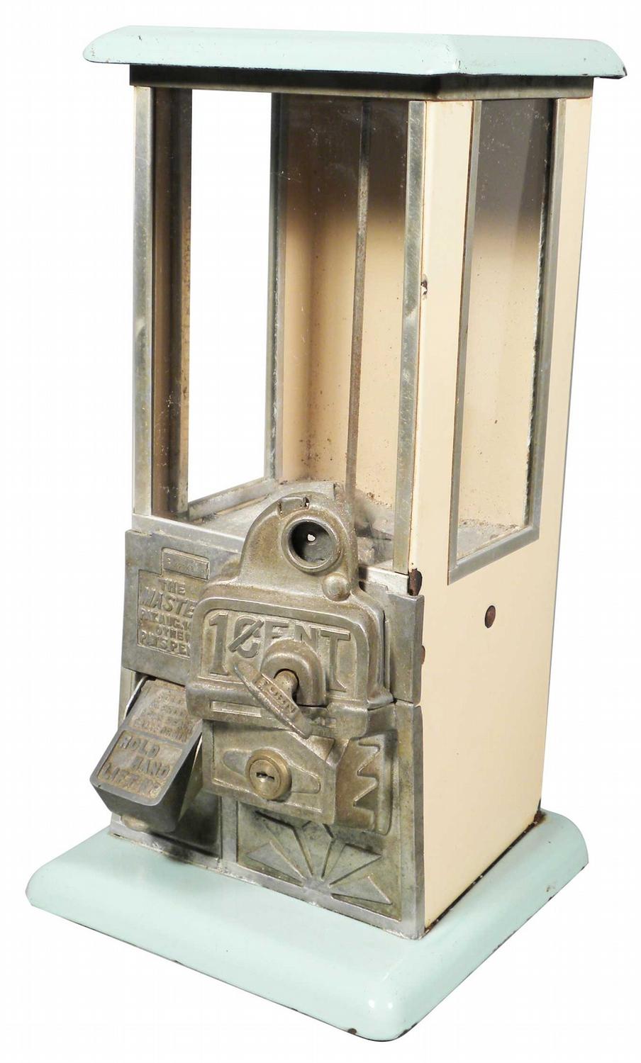 One Cent Master Gum Ball Machine. Green/Cream porcelain. Excellent original condition, no key. 8 X 16 1/2 X 8 inches.