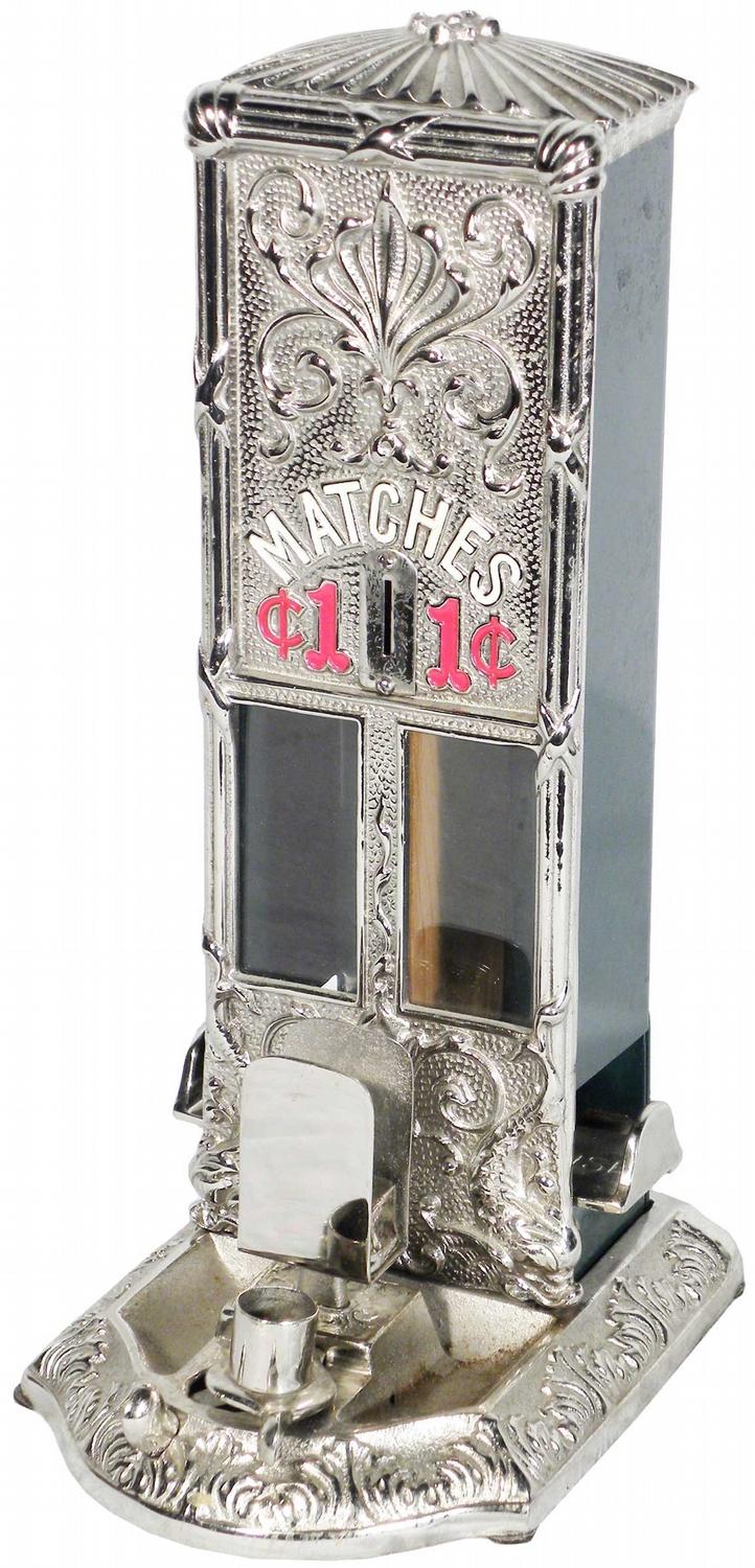 One Cent Match Dispenser and Cigar Cutter. Nickel plated cast iron. Excellent restored condition. 6 3/4 X 13 1/2 X 7 inches.