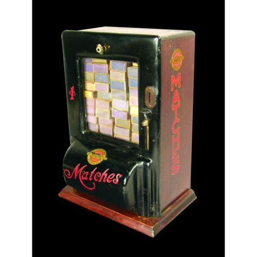 One Cent Match Dispenser by W.J. Robinson. Reading, PA. Coin operated. Comes with key and full of match boxes. Very good original condition.10 1/4 x 14 1/2 x 7 1/2 inches.