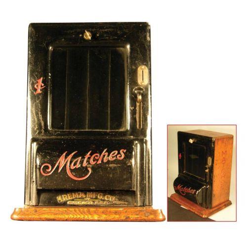 One Cent Oak and Cast Iron Match Dispenser. Krema Mfg Co., Chicago, IL. Very good original condition, with key. 10 1/2 X 14 1/2 X 7 inches.