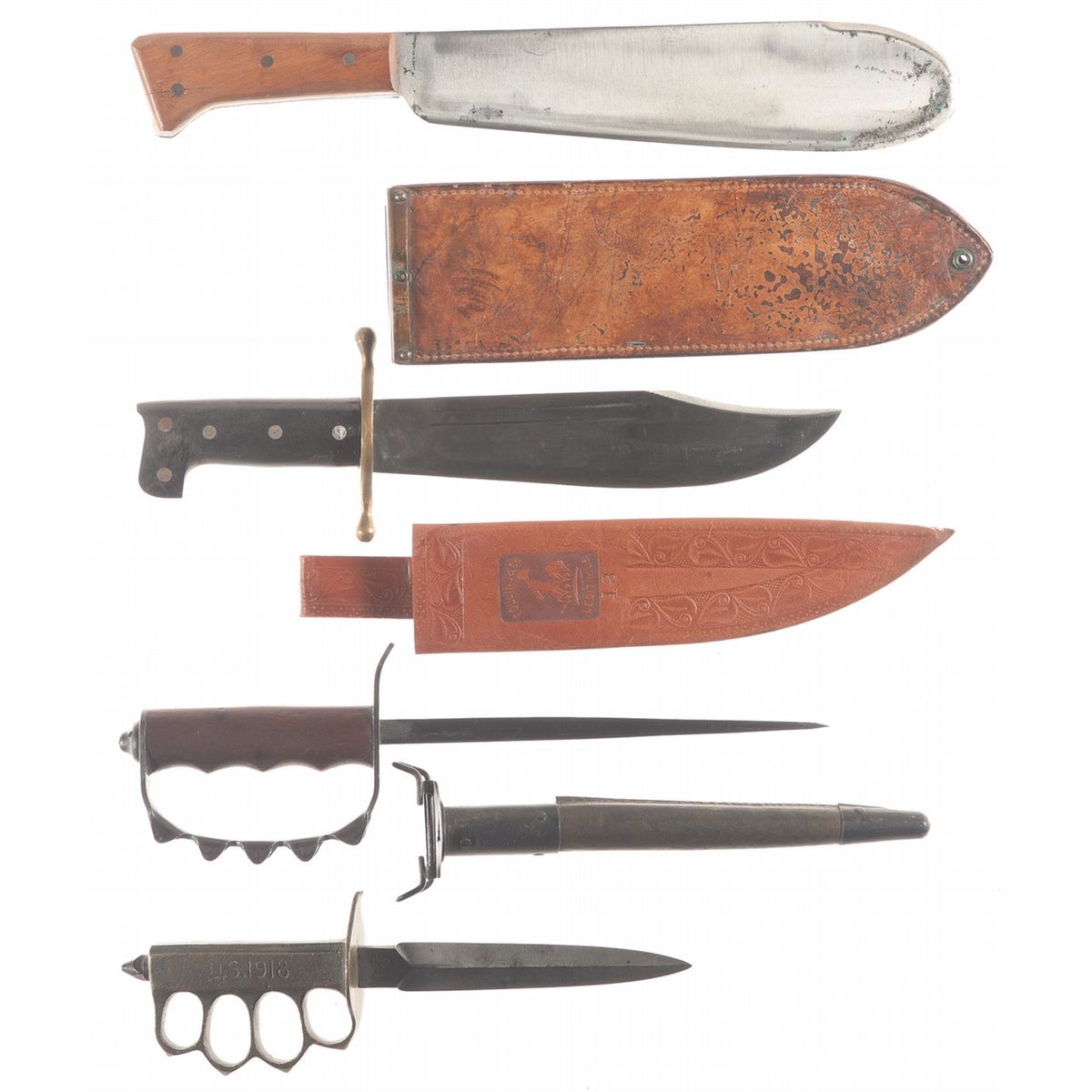 1) U.S.M.C. corpsman's knife, 11 1/4" blade, Chatillon, N.Y. address, wood grips, 1945 dated leather sheath. 2) Collins Legitimus bowie, 9 1/2" blade, brass guard, horn grip and leather sheath. 3) U.S. A.C.Co. 1917 trench knife, 9" spike, triangular flanged guard, wood grip, green leather sheath. 4) Au Lion marked 1918 trench knife, 6 1/2" blade, brass hilt. Good or better overall.