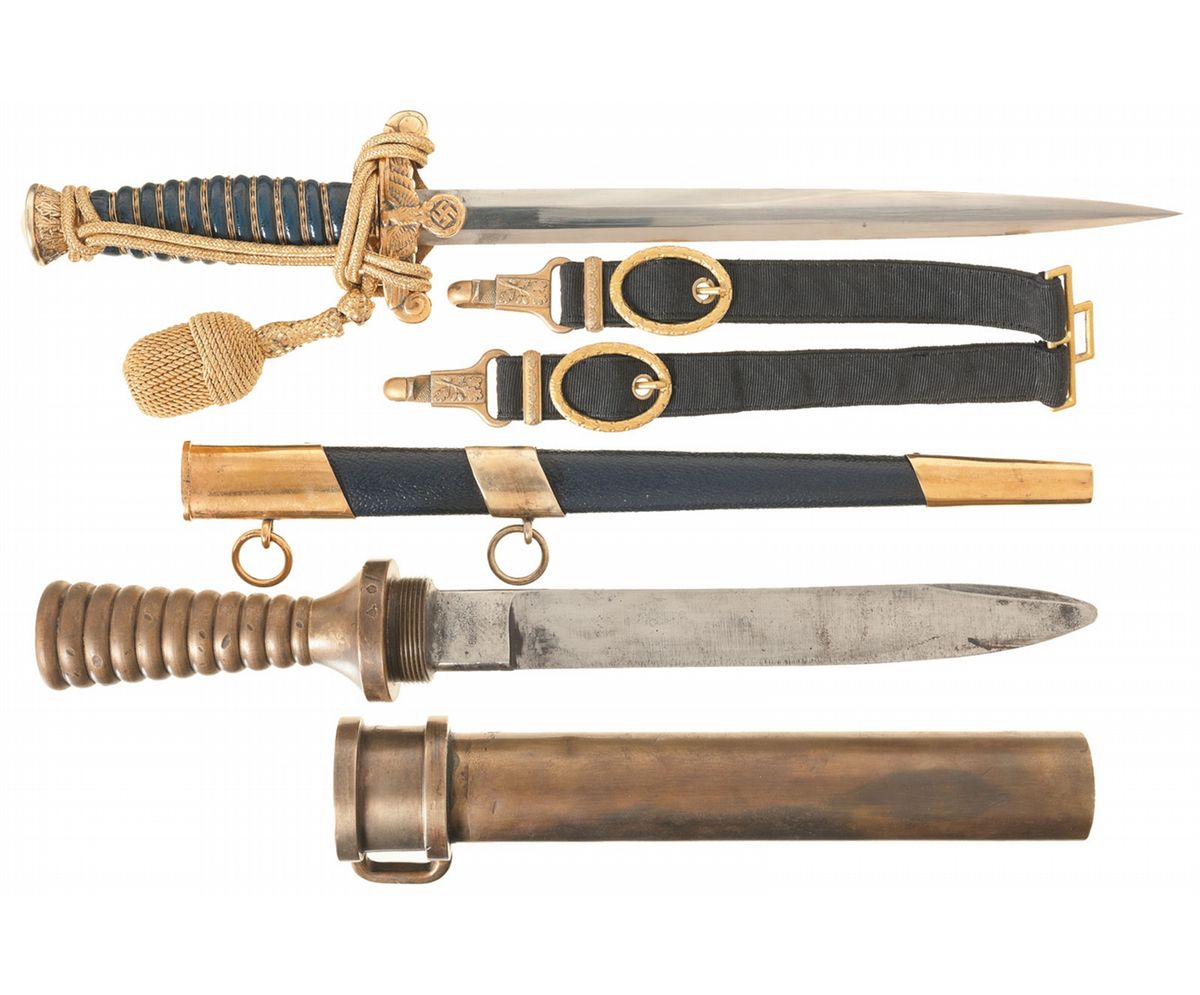 1) Nazi Water Customs officers dagger, blue wire wrapped leather handle, blue leather scabbard with brass hardware, hanger and gold knot, no maker's mark, very good. 2) Brass German divers knife Aug. Luneburg maker's mark. Overall good plus with a few repaired dents on the scabbard.