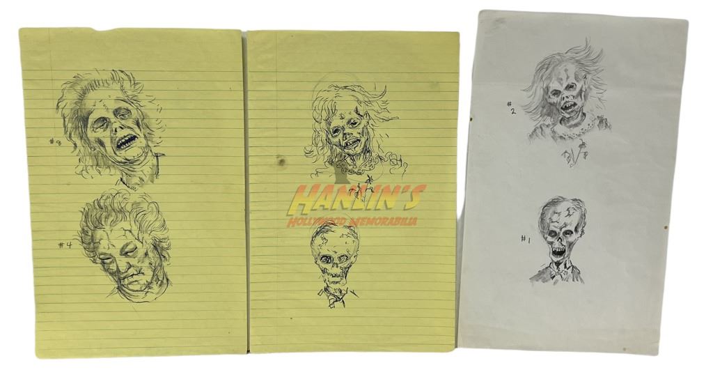Original set of 3 hand drawn design artwork pages used in the production of the Tom McLoughlin directed supernatural horror film 'One Dark Night' (1982), which follows three teenagers sent to a mausoleum for the night as part of a high school initiation rite. A dead, telekinetic occultist returns from the dead and haunts them, forcing the three to survive the night inside the crypt.