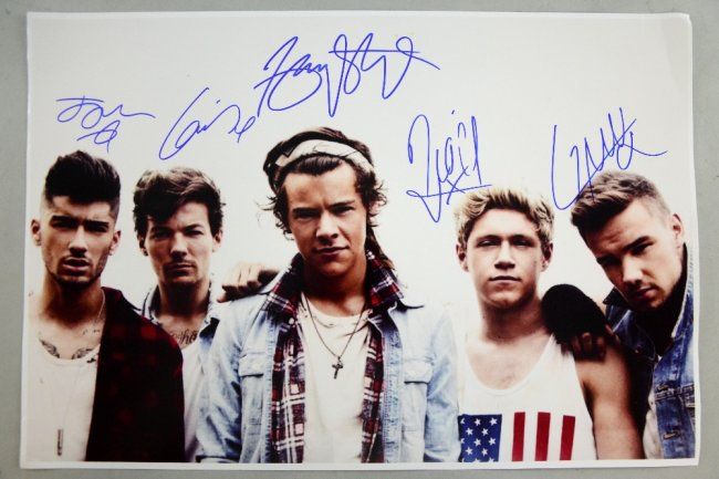 One Direction, English-Irish pop boy band, a large signed photograph of the band by all five members 12 x 17?in. (30 x 43cm)